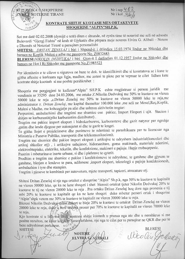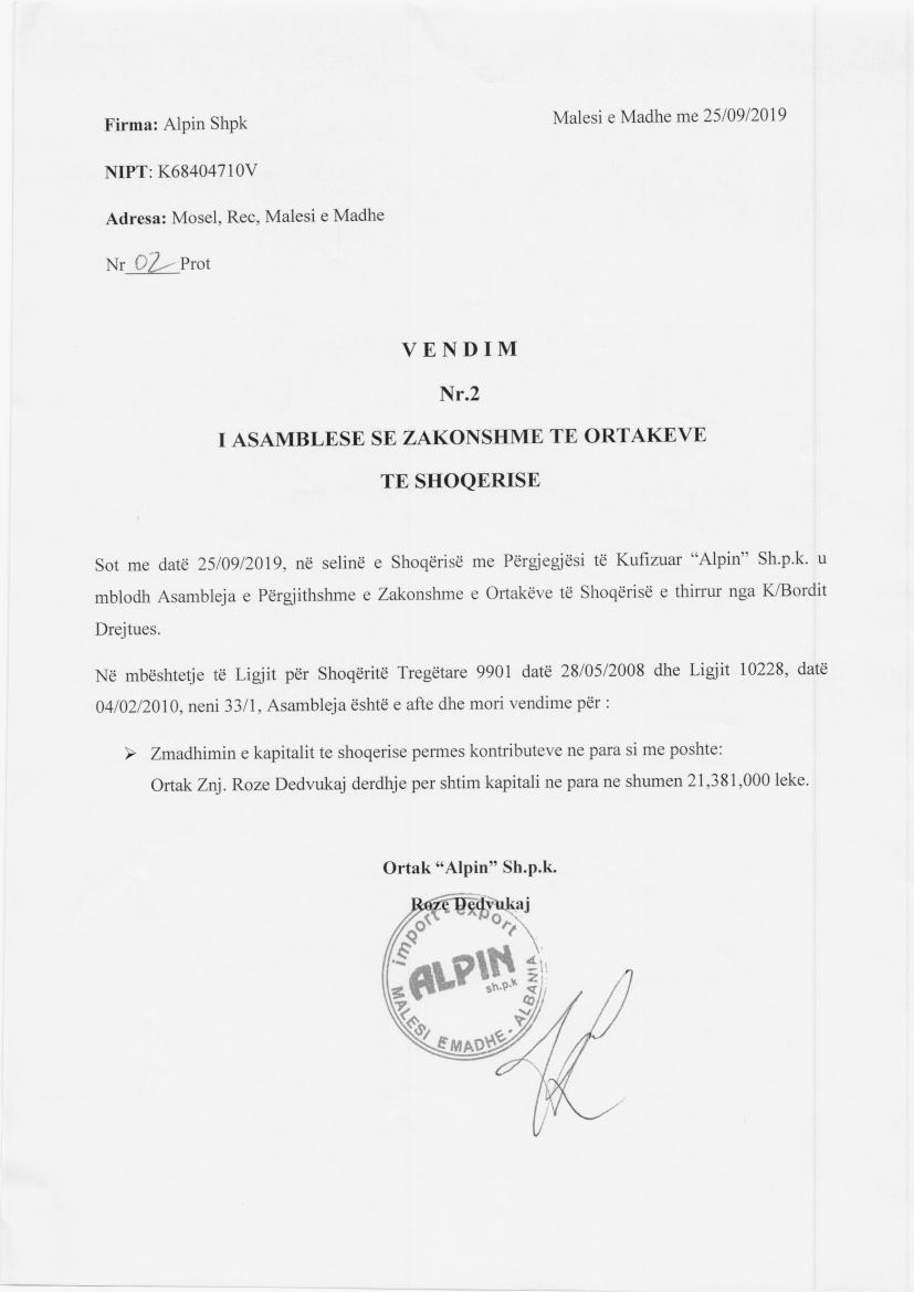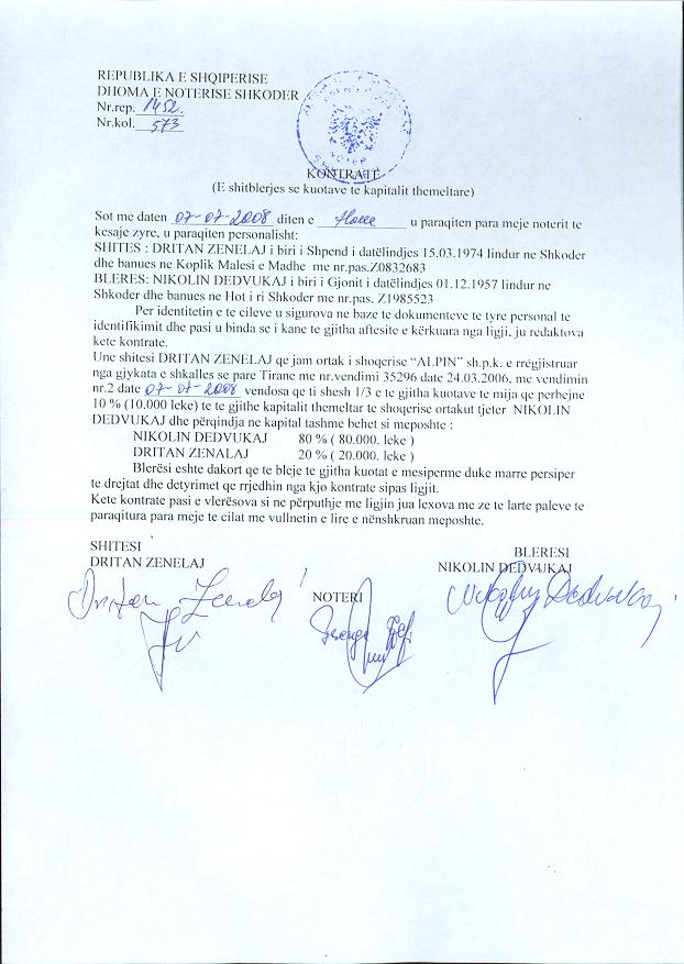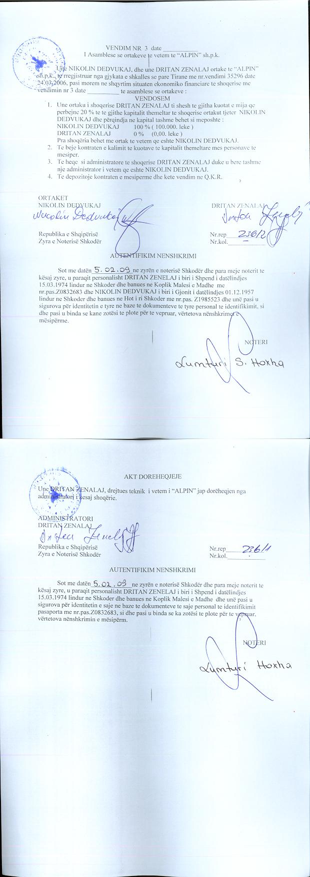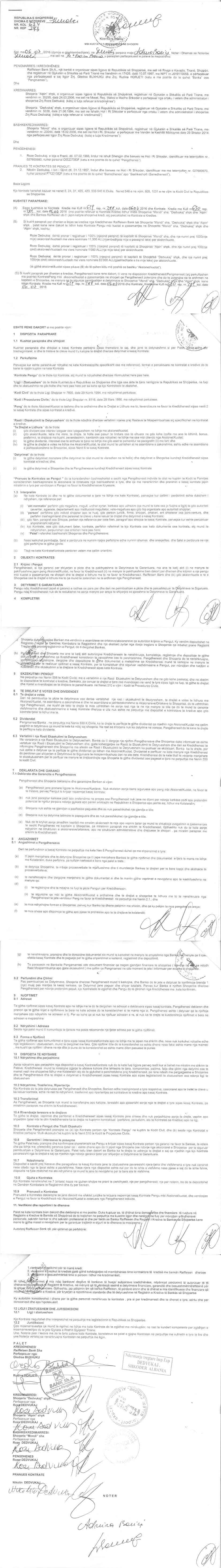 → Ekstrakt Historik i Regjistrit Tregtar date 27.03.2024 → Akt themelimi dhe Statuti i Shoqerise → Kontratë Shitje e Kuotave datë 02.02.2008 → Kontratë Shitblerje e Kuotave të Kapitali Themeltar datë 07.07.2008 → Vendim i Asamblesë së Ortakëve, Shitja e Kuotave datë 05.02.2009 → Kontratë Dhurimi e Pasurisë së Luajtshme Kuota (Aksione) datë 13.11.2013 → Vendim i Ortakut të Vetëm, Zmadhim Kapitali datë 25.09.2019 → Kontratë Hipoteke datë 08.11.2013 → Marrëveshje Siguruese datë 19.11.2014 → Kontratë Pengu datë 06.07.2016 → Marrëveshje Financimi datë 25.07.2019 → Marrëveshje Siguruese datë 01.10.2020 → Marrëveshje Siguruese datë 18.03.2021 |