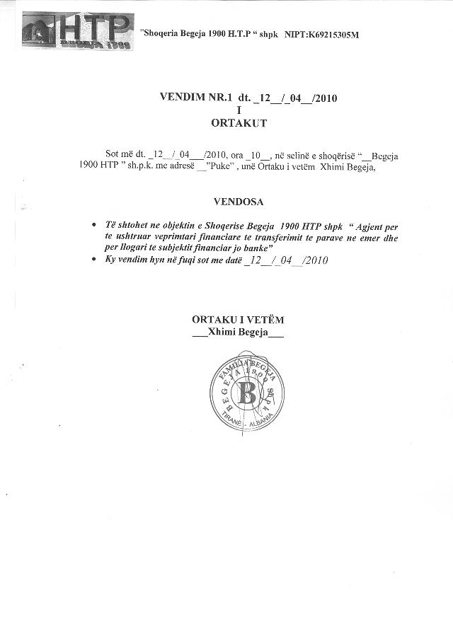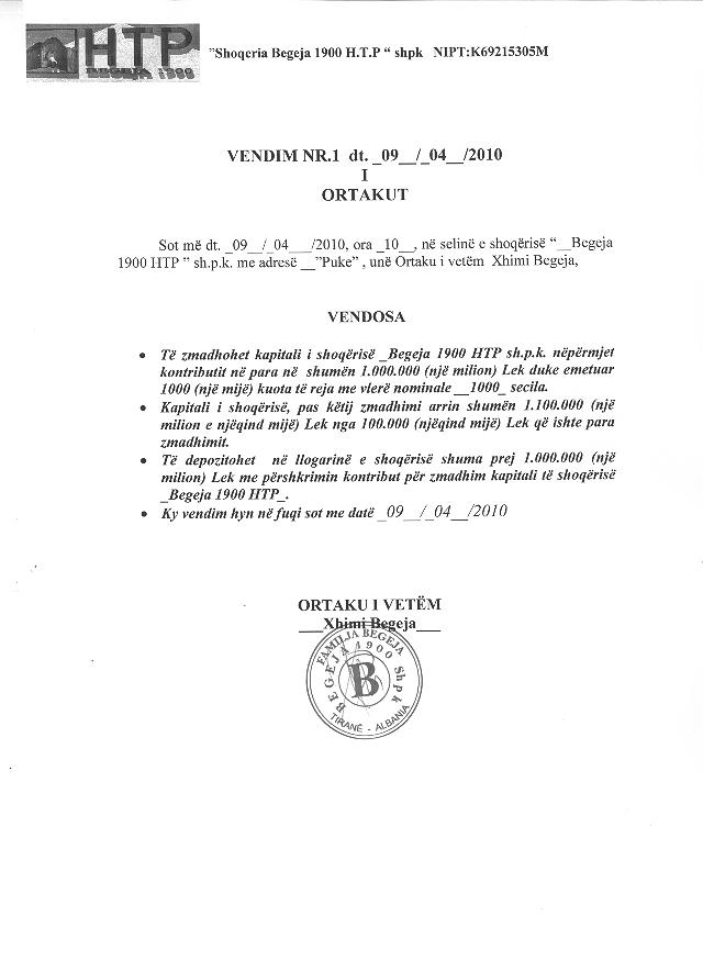 → Ekstrakt Historik i Regjistrit Tregtar, date 2.12.2021 → Vendimi i Asamblese se ortakeve, date 09.04.2010 → Vendimi i Asamblese se Orrtakeve, date 12.04.2010 → Vendimi i Asamblese se Ortakeve, date 04.05.2021 |