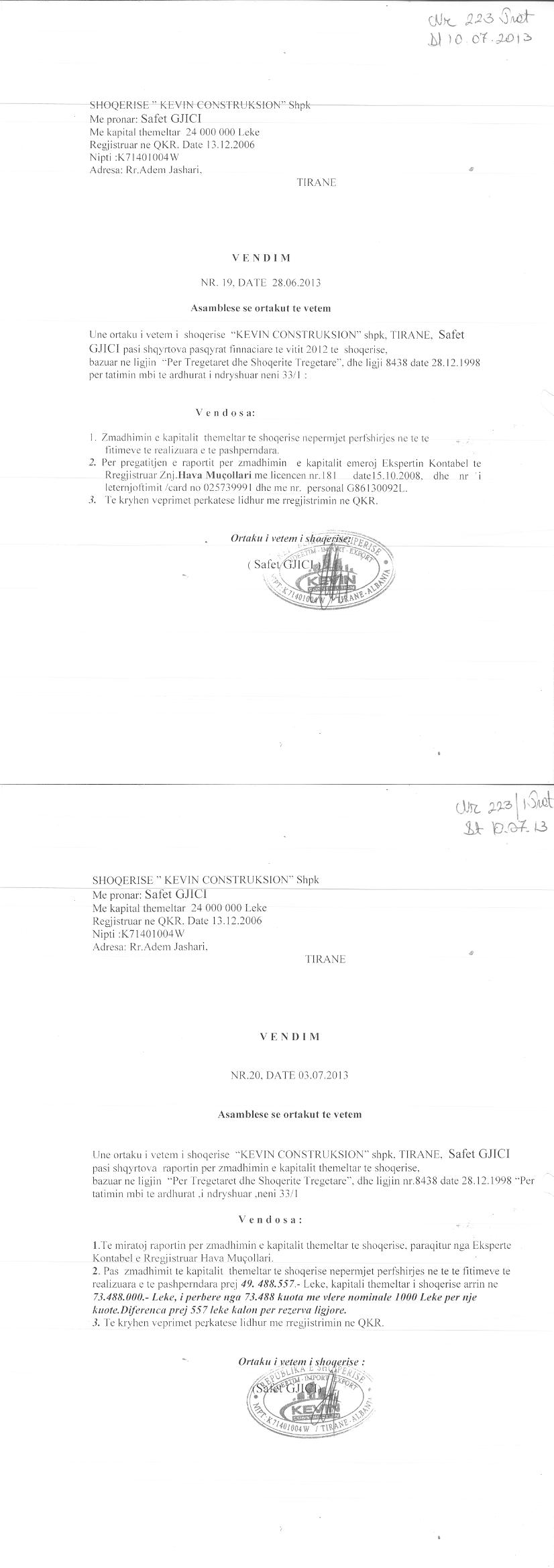→ Ekstrakt historik i regjistrit tregtar 03.06.2021 → Akti i themelimit → Kontrate dhurimi kuotash dhe kapitalesh 19.04.2014 → Vendimi i ortakut per zmadhimin e kapitalit 28.06.2013 → Vendimi i ortakut te vetem per zmadhimin e kapitalit 15.07.2010 → Vendim i ortakut per rritjen e kapitalit 22.10.2018 → Ekstrakti Historik i Regjistrit Tregtar date 19.01.2023 → Ekstrakti Historik i Regjistrit Tregtar date 25.05.2023 → Ekstrakt Historik i Regjistrit Tregtar date 11.08.2023 → Ekstrakt historik i regjistrit tregtar date 04.08.2025 |