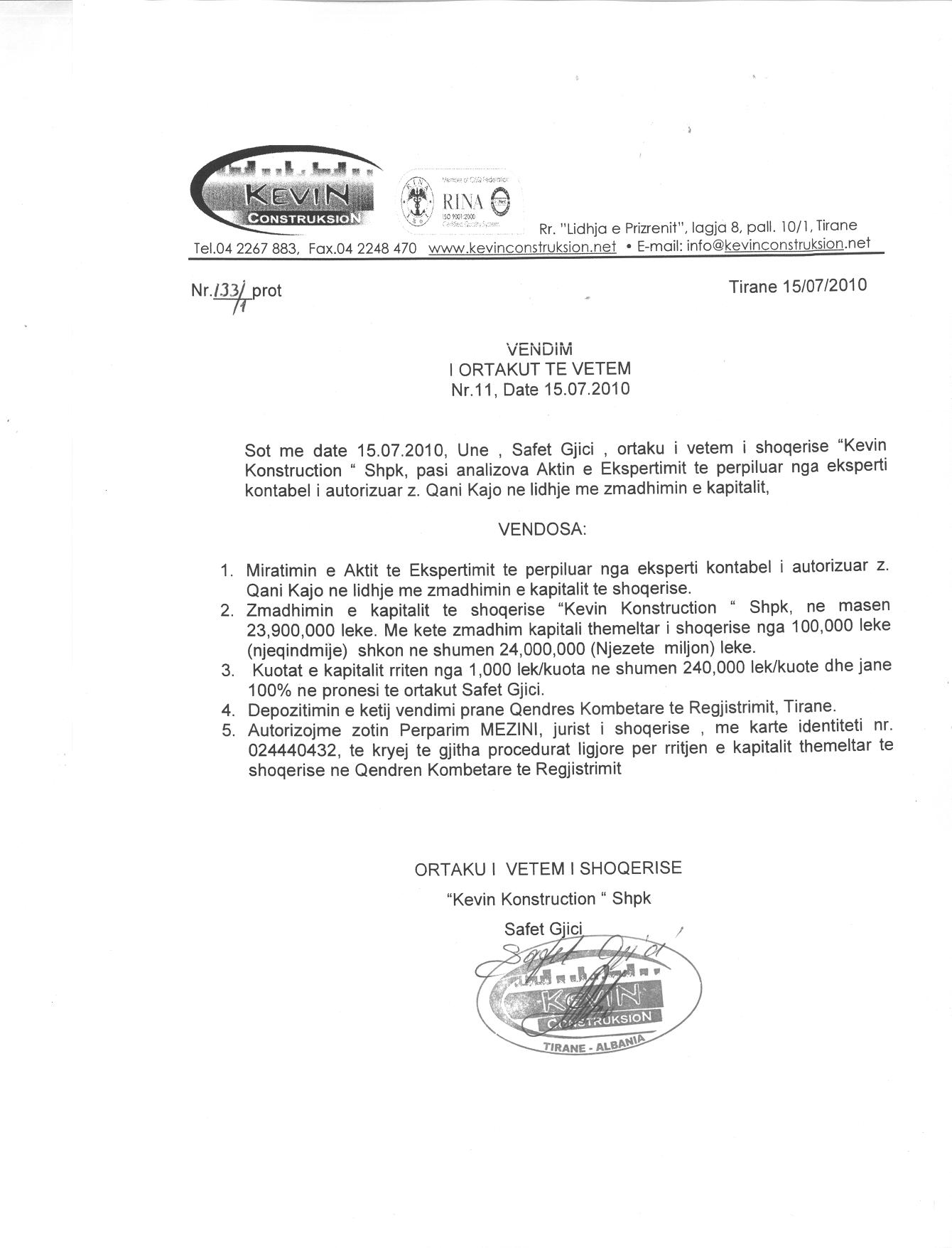 | Emërtime të tjera Tregtare: | KEVIN CONSTRUKSION |