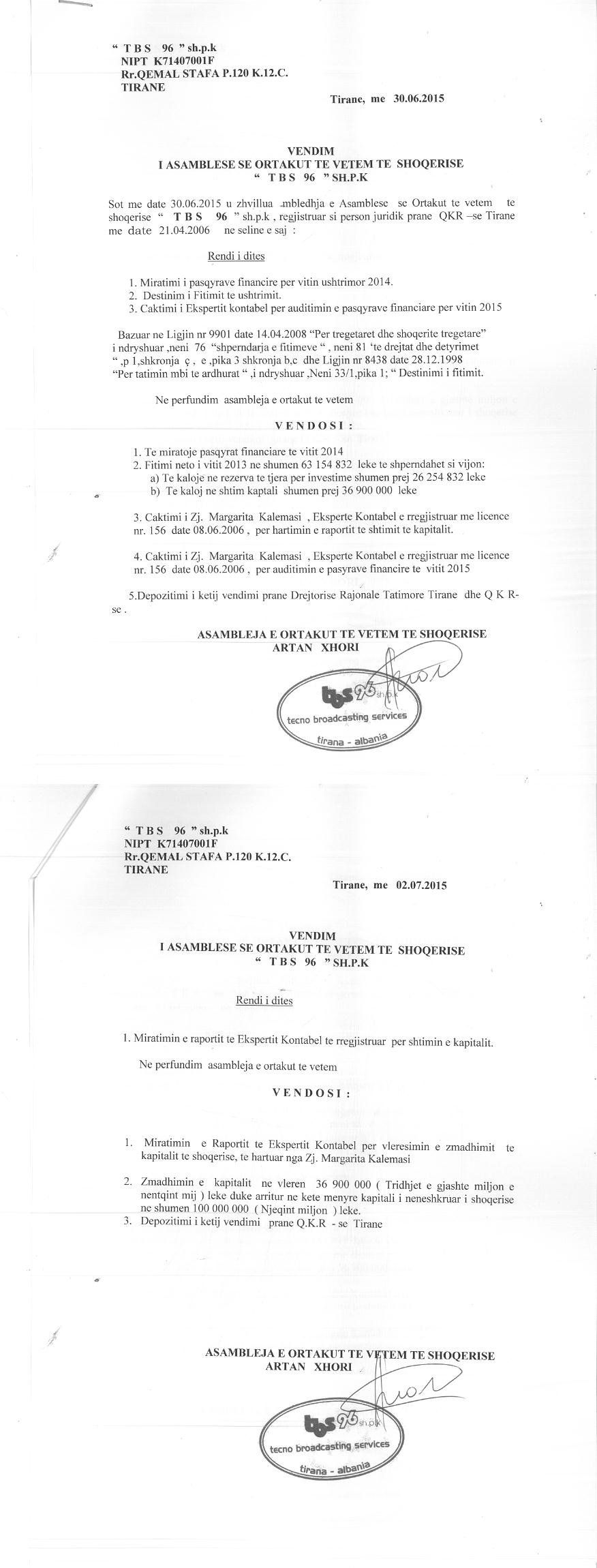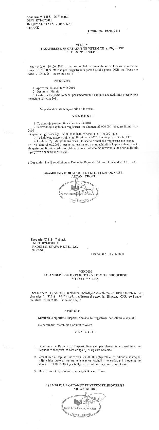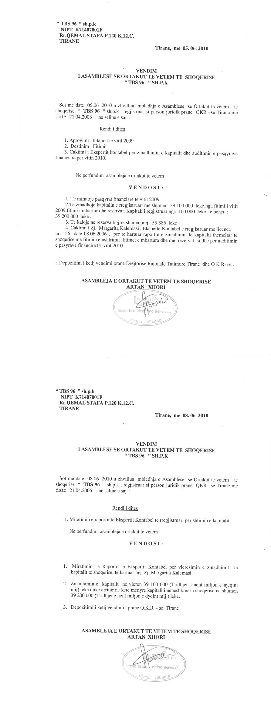 → Ekstrakt historik i regjistrit tregtar 06.02.2021 → Akti i themelimit dhe statuti → Vendimi per zmadhimin e kapitalit 05.06.2010 → Vendimi per zmadhimin e kapitalit 10.06.2011 → Vendimi i ortakut te vetem per zmadhimin e kapitalit 30.06.2015 → Ekstrakt Historik i Regjistrit Tregtar date 09.12.2024 |
