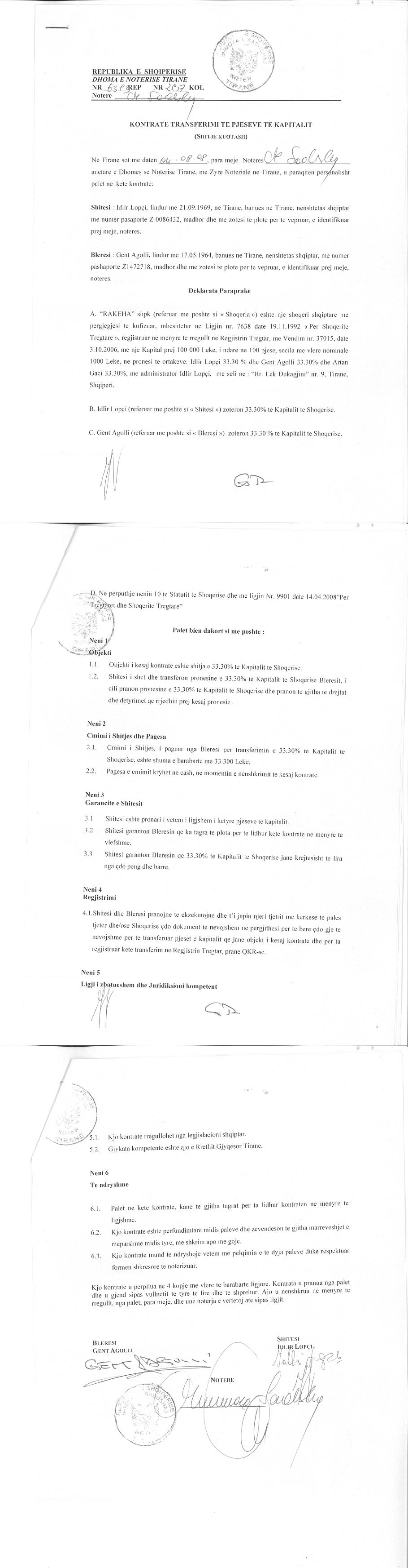 | Çështje Ligjore: | I.Me date 26.09.2012, eshte depozituar urdheri Nr.537-12 Regj., Nr.28592 Prot., lëshuar nga Shoqëria “Shërbimi Përmbarimor ZIG” sh.p.k., ku është urdhëruar:"Vendosja e masës së sekuestros konservative në aktivet e palës debitore Z.Idlir Myfit Lopçi, që zotëron në shoqërinë e regjistruar “RAKEHA” sh.p.k., me NIPTK71415008J dhe në shoqëritë e tjera të regjistruara pranë regjistrit tregtar. Aktivet e mësipërme do të qëndrojnë të sekuestruara deri në një urdhëresë të dytë. II.Me date 15.01.2013, eshte depozituar Kërkesa Nr.537-12 Regj. Nr.01114 Prot, lëshuar nga Shoqëria "Shërbimi Përmbarimor ZIG" sh.p.k., ku është kërkuar: "Heqja e sekuestros konservative në aktivet e palës debitore Z. Idlir Myfit Lopçi që zotëron në shoqërinë e regjistruar pranë jush “RAKEHA SHPK” me NUIS(NIPT) 5 K71415008J, sekuestro e cila është vendosur në zbatim të shkesës nr 28592 Prot., datë 25.03.2012, “Urdhër për vënien e skuestros konsevative”. III.Me ane te Akt-Marreveshjes date 14.07.2022, Artan Gaci cakton si person te besuar dhe zoterues aktiv i kuotave Festim Çela ne shoqerine " RAKEHA" shpk. Pas nenshkrimit te marreveshjes Artan Gaci kalon si zoterues pasiv i kuotave, ndersa Festim Çela zoterues aktiv i kuotave. IV.Me date 06.10.2022, eshte ndryshuar statusi i shoqerise nga "Aktiv" ne "Shoqeri ne Likuidim e Siper". |