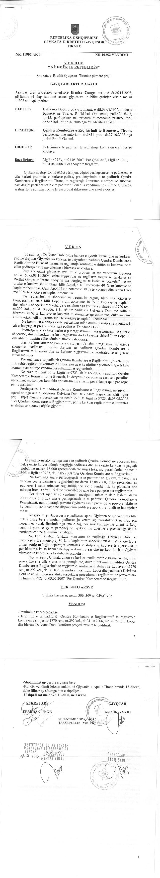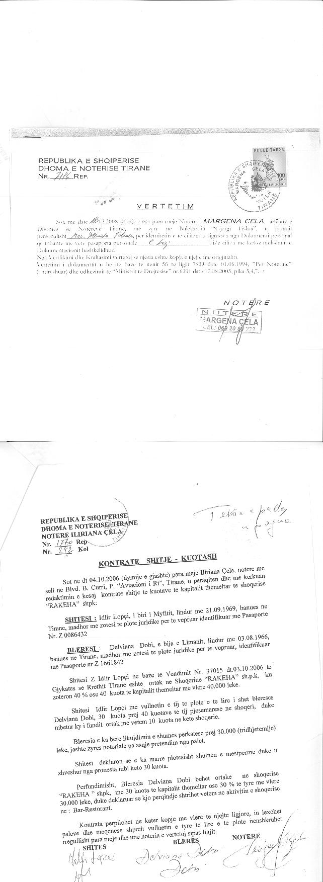 → Ekstrakti Historik i Regjistrit Tregtar date 18.03.2022 → Akti i themelimit te Shoqerise → Kontrate e shitjes se kuotave date 04.08.2008 → Vendim i gjykates se rrethit gjyqesor Tirane, date 26.11.2008 → Kontrate e shitjes se kuotave date 04.10.2006 → Kontrate e dhurimit te kuotave date 10.03.2009 → Urdher per venien e sekuestros konservative date 26.09.2012 → Urdher per heqjen e mases se sekuestros konservative date 15.01.2013 → Ekstrakti Historik i Regjistrit Tregtar date 30.05.2024 → Vendimi i Asamblese se Ortakeve date 14.07.2022 → Akt-Marreveshje date 14.07.2022 |