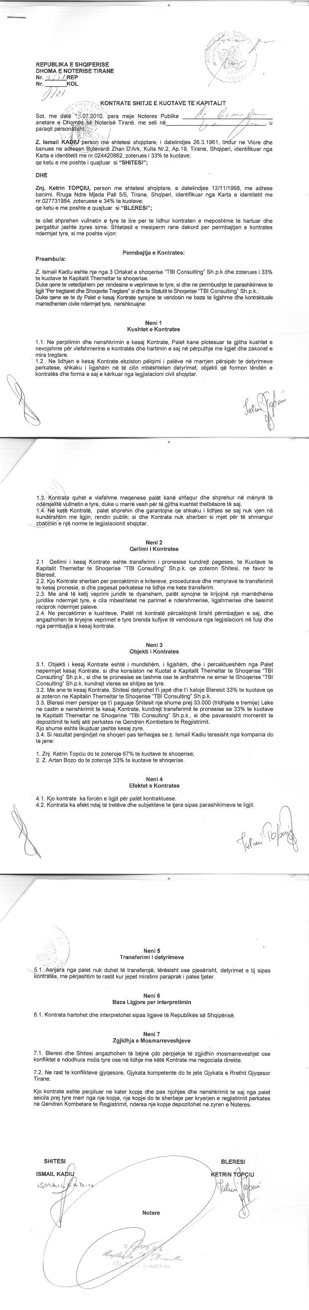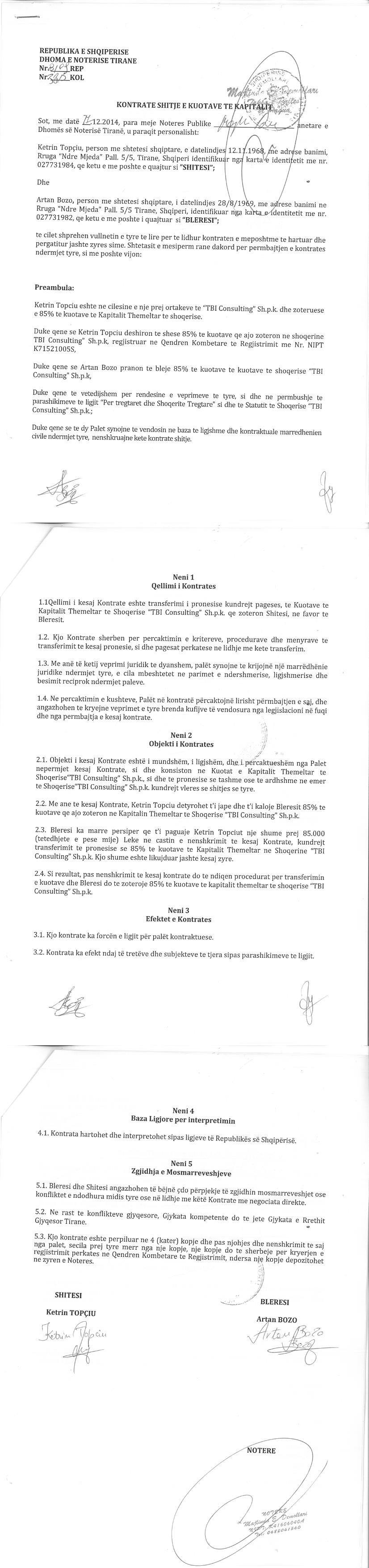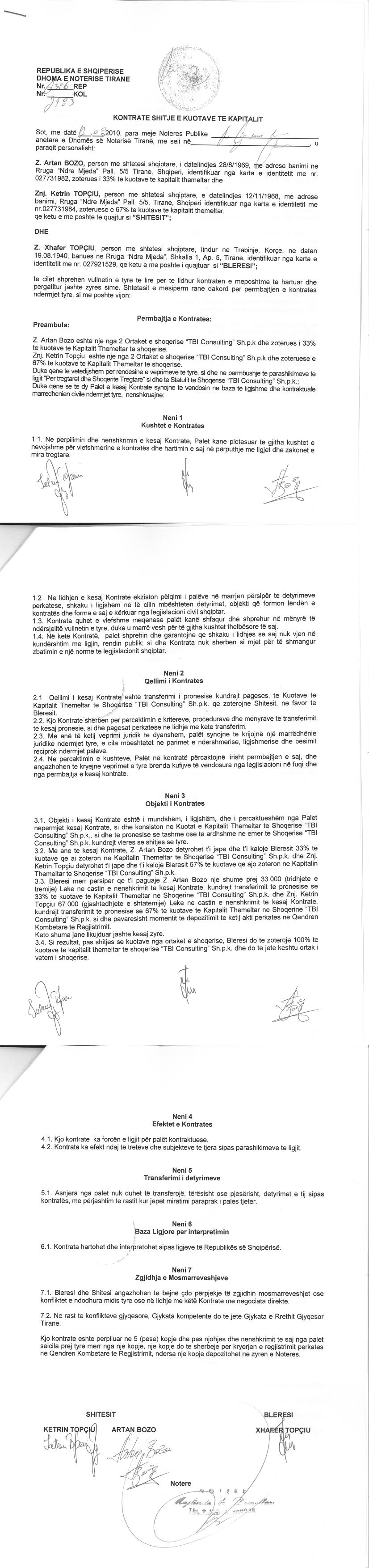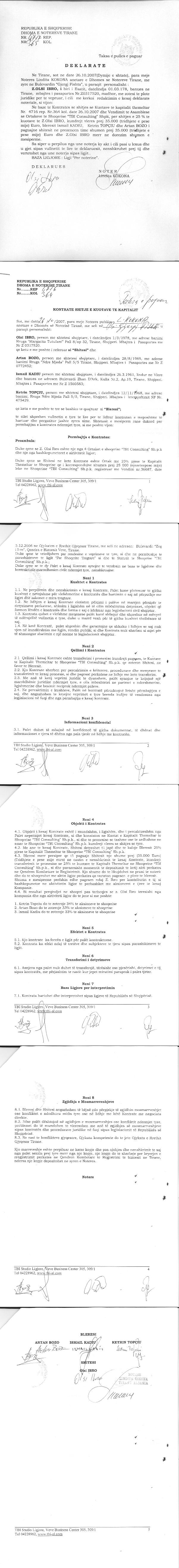 → Ekstrakt Historik i Regjistrit Tregtar date 20.07.2023 → Akt themelimi dhe Statuti i Shoqerise → Kontratë Shitje Kuotash Kapitali datë 26.10.2007 → Kontratë Shitje Kuotash Kapitali datë 13.07.2010 → Kontratë Shitje Kuotash Kapitali datë 12.08.2010 → Kontratë Shitje Kuotash Kapitali datë 20.02.2012 → Kontratë Shitje Kuotash Kapitali datë 13.10.2014 → Kontratë Shitje Kuotash Kapitali datë 27.12.2014 → Kontratë Shitje Kuotash Kapitali datë 04.06.2018 |