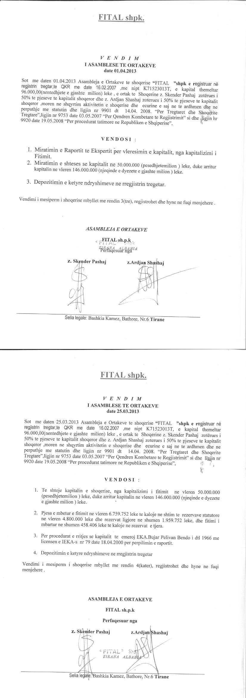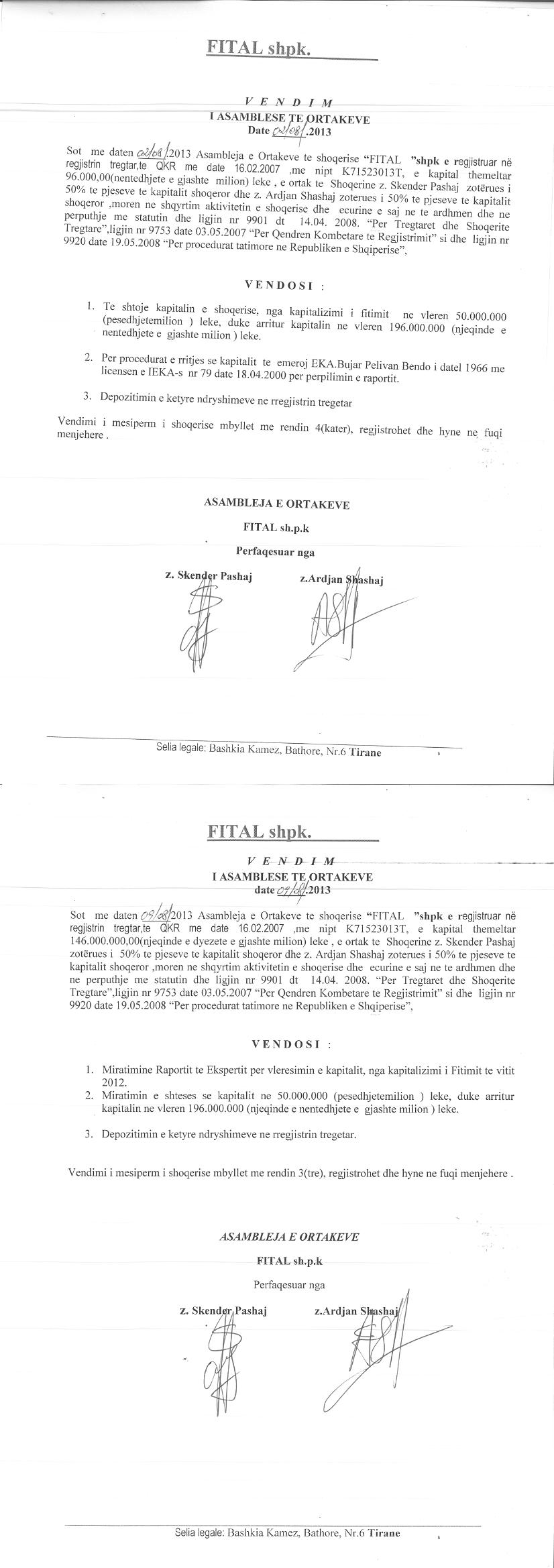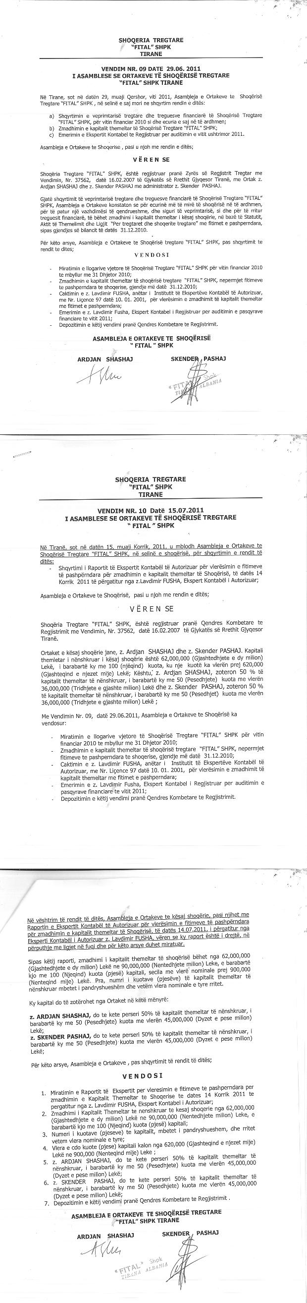 Pashaj. II. Me datë 22.01.2018, me anë të urdherit Nr. 703 Prot., protokolluar nga QKB me Nr.1009 Prot., date 29.01.2018 lëshuar nga “Zyra Permbarimore Tirane” u urdhërua: Heqjen e mases se sekuestros konservative mbi kuotat e subjektit debitor ” FITAL SHPK” sh.p.k., me Nuis (Nipt)- K71523013T me administrator z. Skënder Pashaj, pasi detyrimi eshte ekzekutuar teresisht. Bashkimi me Përthithje I. Me datë 25.06.2012, u hartua dhe miratua Projekt Marrëveshja e Bashkimit me Përthithje ndërmjet shoqërive tregtare “VLAKEDA” shpk (shoqëria e përthithur) dhe “FITAL” shpk (shoqëria përthithëse). Të drejtat dhe detyrimet që rrjedhin nga aksionet e “shoqërisë përthithëse” mbeten të pandryshuara dhe referohen në statusin e saj. II. Me datë 30.06.2012, u miratua Raporti i Bashkimit të Shoqërive. Raportet e kuotave të zotëruara nga ortakët e shoqërisë përthithëse mbeten të njëjta. Kapitali i shoqërisë përthithëse zmadhohet në masën e kapitalit të shoqërisë së përthithur. Shoqëria e përthithur “VLAKEDA” shpk do të çregjistrohet pas bashkimit. |
