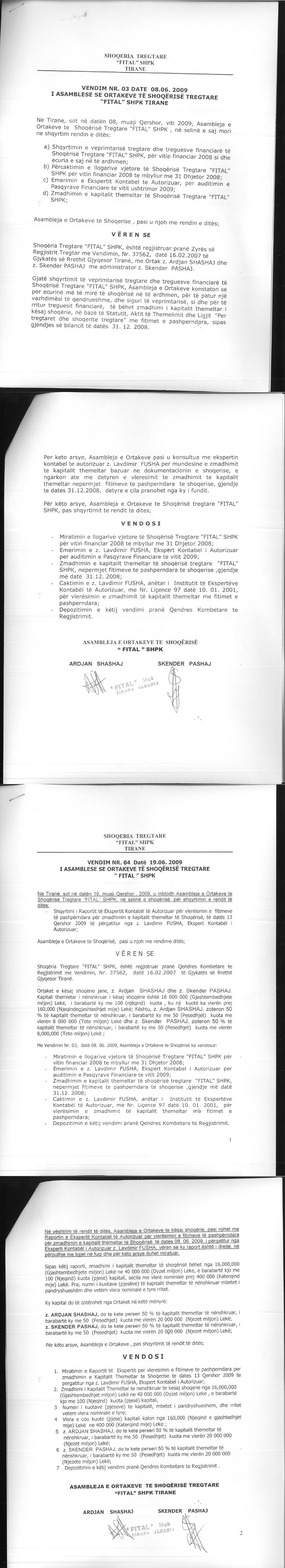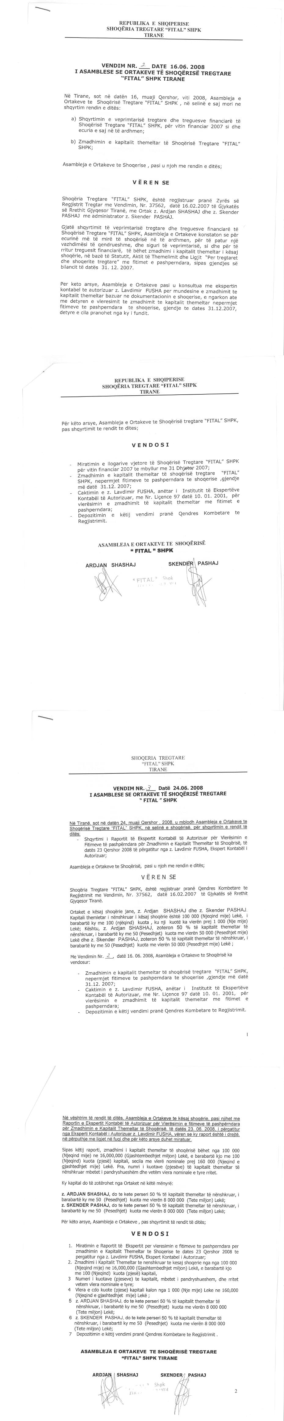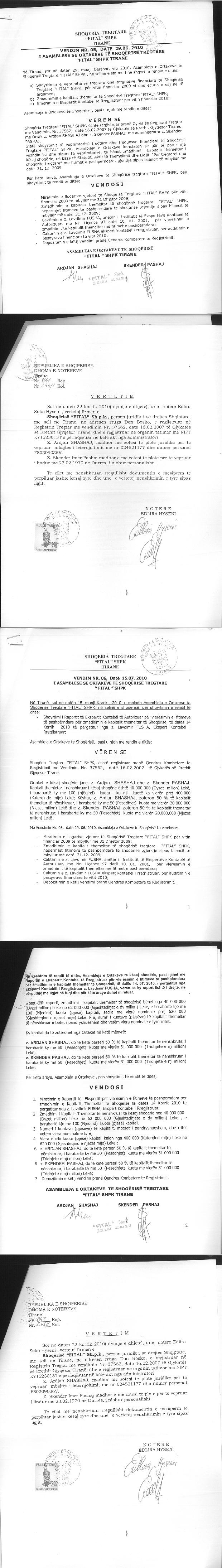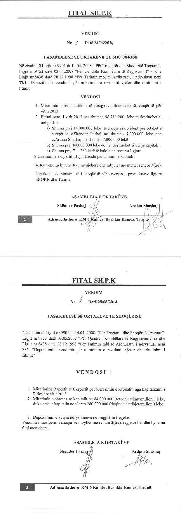 Pashaj. II. Me datë 22.01.2018, me anë të urdherit Nr. 703 Prot., protokolluar nga QKB me Nr.1009 Prot., date 29.01.2018 lëshuar nga “Zyra Permbarimore Tirane” u urdhërua: Heqjen e mases se sekuestros konservative mbi kuotat e subjektit debitor ” FITAL SHPK” sh.p.k., me Nuis (Nipt)- K71523013T me administrator z. Skënder Pashaj, pasi detyrimi eshte ekzekutuar teresisht. Bashkimi me Përthithje I. Me datë 25.06.2012, u hartua dhe miratua Projekt Marrëveshja e Bashkimit me Përthithje ndërmjet shoqërive tregtare “VLAKEDA” shpk (shoqëria e përthithur) dhe “FITAL” shpk (shoqëria përthithëse). Të drejtat dhe detyrimet që rrjedhin nga aksionet e “shoqërisë përthithëse” mbeten të pandryshuara dhe referohen në statusin e saj. II. Me datë 30.06.2012, u miratua Raporti i Bashkimit të Shoqërive. Raportet e kuotave të zotëruara nga ortakët e shoqërisë përthithëse mbeten të njëjta. Kapitali i shoqërisë përthithëse zmadhohet në masën e kapitalit të shoqërisë së përthithur. Shoqëria e përthithur “VLAKEDA” shpk do të çregjistrohet pas bashkimit. |