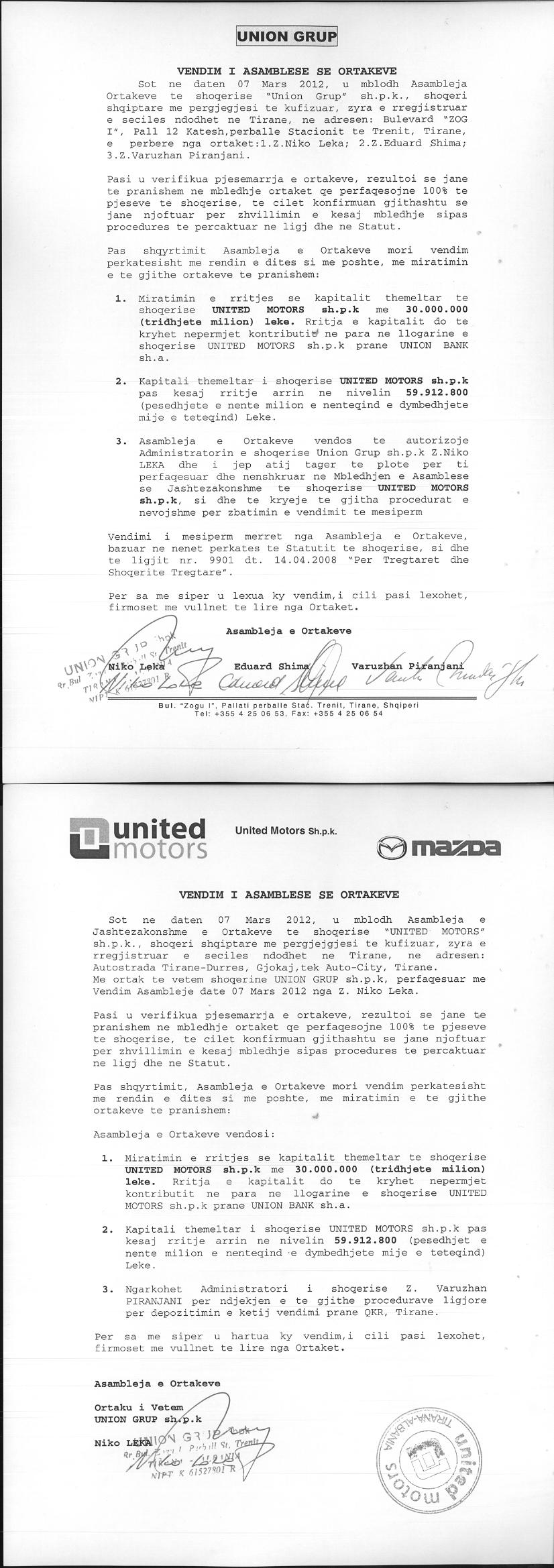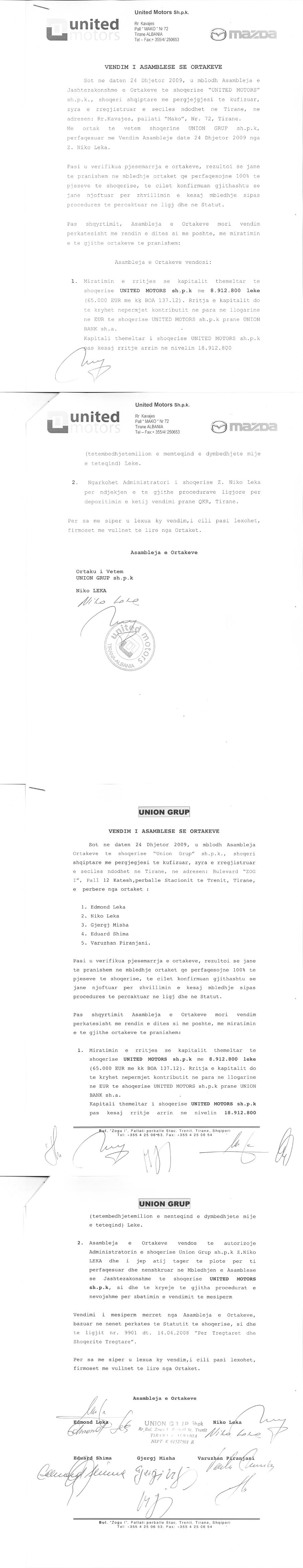 → Ekstrakt Historik i Regjistrit Tregtar date 05.07.2023 → Akt themelimi dhe Statuti i Shoqerise → Vendim i Asamblesë së Ortakëve, Zmadhim Kapitali datë 24.12.2009 → Vendim i Asamblesë së Ortakëve, Zmadhim Kapitali datë 27.12.2011 → Vendim i Asamblesë së Ortakëve, Zmadhim Kapitali datë 07.03.2012 → Vendim i Ortakut të Vetëm, Bashkimi me Përthithje datë 08.04.2020 → Projekt për Bashkimit me Përthithje të Shoqërive tregtare "Auto Master" Sha dhe "United Motors" Shpk datë 08.04.2020 → Marrëvesheshje për Bashkimin e Shoqërive tregtare "Auto Master" Sha dhe "United Motors" Shpk nëpërmjet përthithjes datë 30.05.2020 → Ekstrakt Historik i Regjistrit te Pronareve Perfitues date 05.07.2023 |