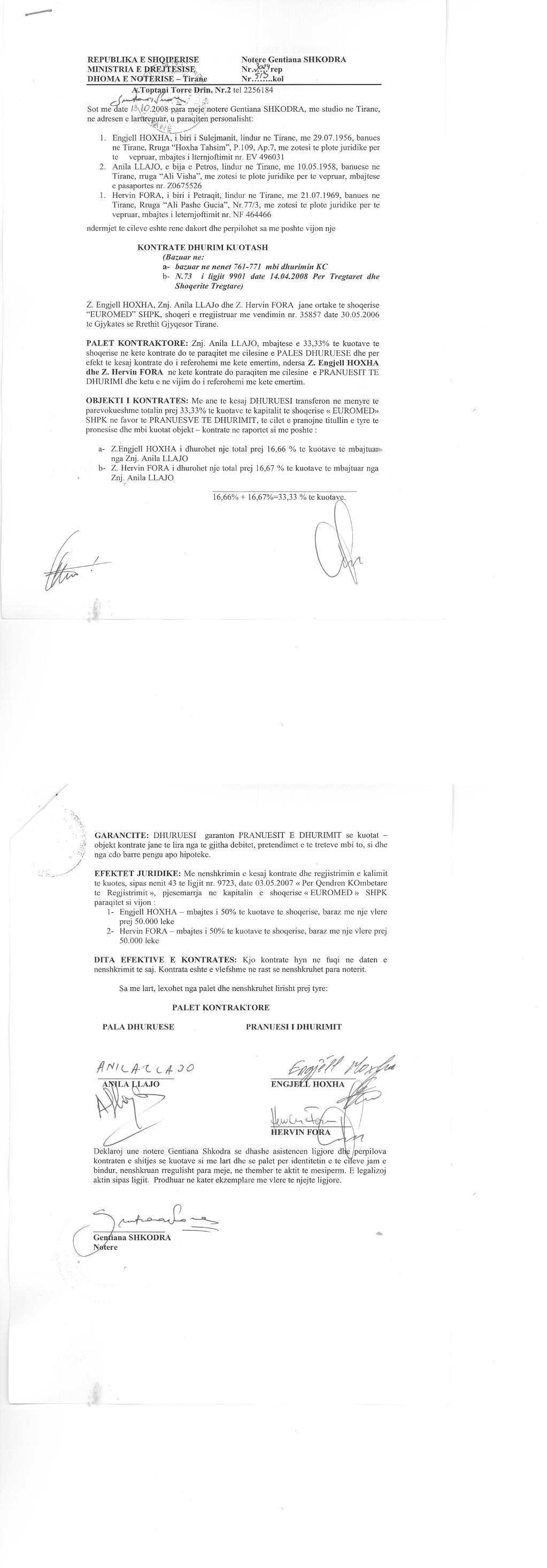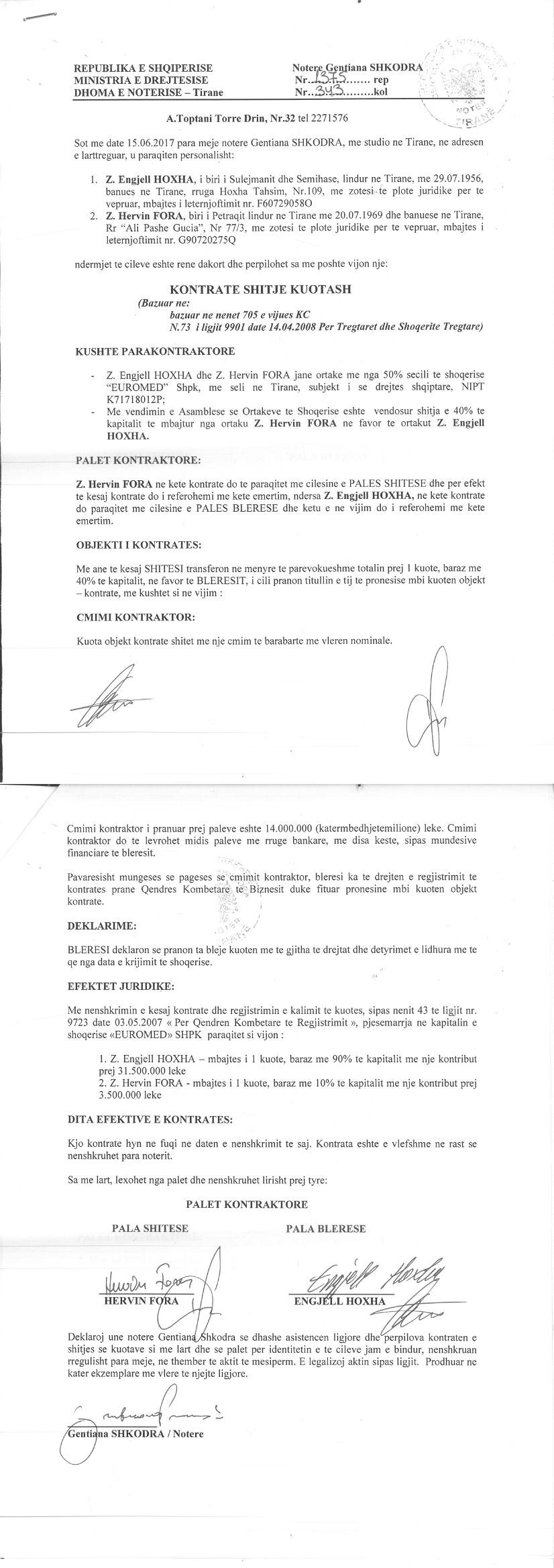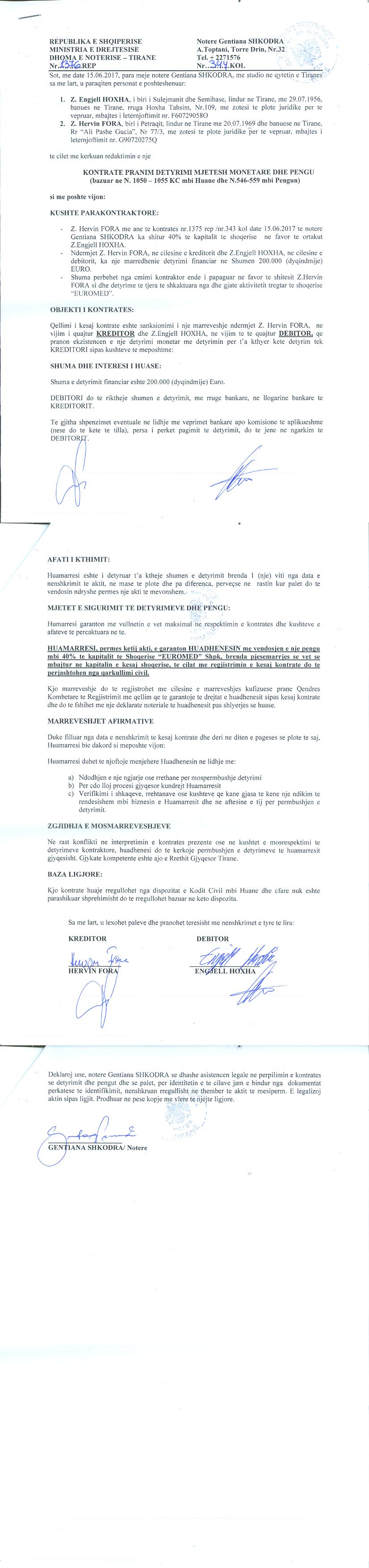 | Çështje Ligjore: | I. Më datë 11.02.2015, me anë të shkresës Nr. 12538 Prot, të Drejtorisë Rajonale Tatimore Tiranë, u vendos të mos lejohen të kryhen tjetërsime mbi titujt e pronësisë, përfshirë dhe shitblerje aksionesh deri në shlyerjen e detyrimeve tatimore, për tatimpaguesin “EUROMED” sh.p.k., me NIPT K71718012P. II. Më datë 11.03.2015, me anë të shkresës Nr. 18516 Prot, lëshuar nga Drejtoria Rajonale Tatimore Tiranë, u kërkua lirimi nga barra e titujve të pronësisë për subjektin “EUROMED”, me NUIS- K71718012P, vendosur me shkresën Nr.12538 Prot, datë 11.2.2015. III. Më datë 15.06.2017, u lidh kontrata Nr.1376 Rep, Nr.344 Kol “Pranim detyrimi mjetesh monetare dhe pengu” me objekt: Qëllimi i kësaj kontrate eshte sanksionimi i nje marrëveshje ndërmjet Z.Hervin Fora, ne vijim i quajtur Kreditor dhe Z.Engjëll Hoxha, në vijim të quajtur Debitor, që pranon ekzistencën e një detyrimi monetar me detyrimin për ta kthyer këtë detyrim tek kreditori sipas kushteve të kësaj kontrate. |