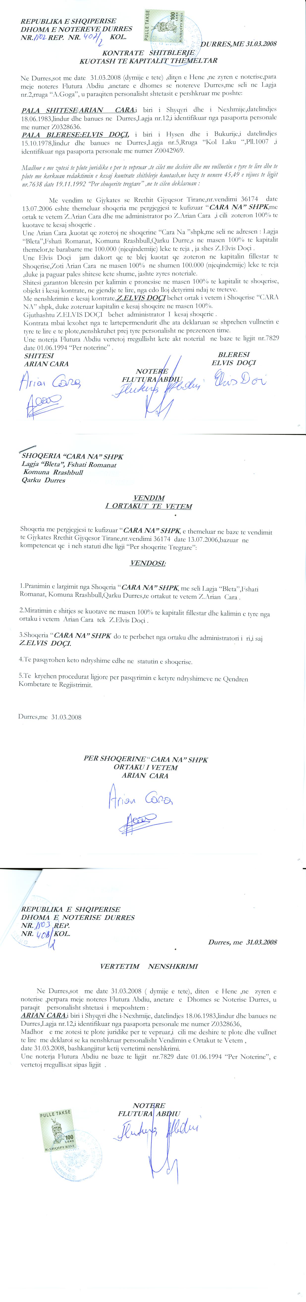 → Ekstrakt Historik i Regjistrit Tregtar date 22.05.2025 → Vendim per Regjistrimin e Shoqerise → Kontrate shitblerje kuotash date 31.03.2008 |