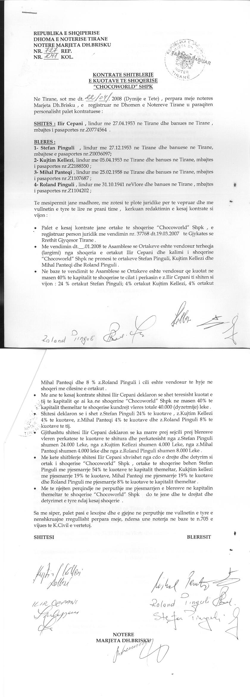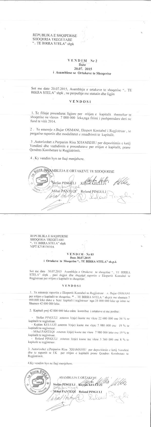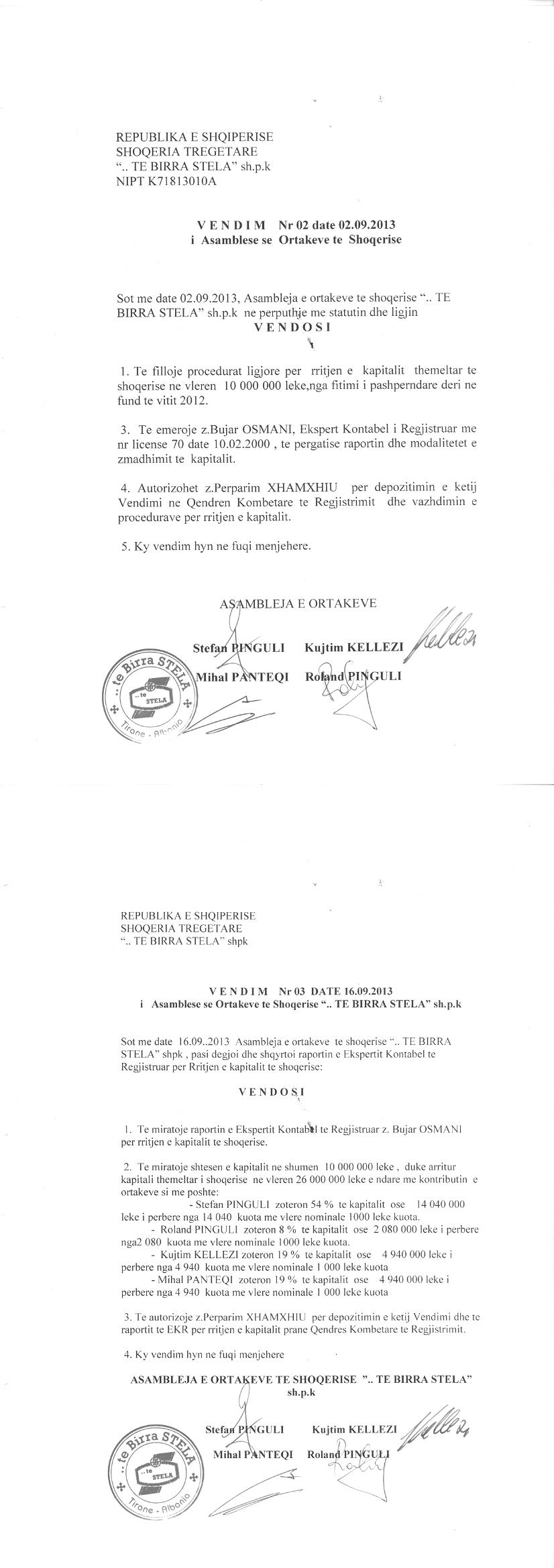 → Ekstrakti Historik i Regjistrit Tregtar date 28.01.2022 → Statuti fillestar i shoqerise dhe dokumenta te ndryshem → Statuti i Shoqerise → Vendim i Asamblese se Pergjithshme date 15.09.2011 → Vendim i Asamblese se Pergjithshme date 31.07.2012 → Vendim i Asamblese se Pergjithshme date 02.09.2013 → Vendim i Asamblese se Pergjithshme date 28.08.2014 → Vendim i Asamblese se Pergjithshme date 30.07.2015 → Vendim i Asamblese se Pergjithshme date 18.07.2016 → Vendim i Asamblese se Pergjithshme date 15.09.2017 → Vendimi i Asamblese se Pergjithshme date 16.08.2018 → Vendim i Asamblese se Pergjithshme date 06.09.2019 → Vendim i Asamblese se Pergjithshme date 28.09.2020 → Kontrate e Shit-Blerjes se Kuotave date 22.04.2008 |