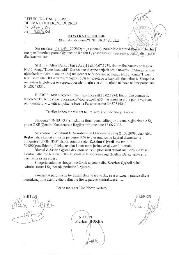 → Ekstrakt historik i regjistrit tregtar 05.02.2022 → Akti I themelimit → Kontrate shitje kuotash 21.07.2009 → Kontrate shitje kuotash kapitali 10.04.2015 → VKM nr. 54, datë 05.02.2014, Për përcaktimin e kritereve, të procedurës e të mënyrës së dhënies me qira, enfiteozë apo kontratave të tjera të pasurisë shtetërore → LIGJ Nr. 37/2019 PËR DISA SHTESA NË AKTIN NORMATIV, ME FUQINË E LIGJIT, NR. 4, DATË 9.7.2008, TË KËSHILLIT TË MINISTRAVE → Ekstrakt Historik i Regjistrit Tregtar date 08.12.2023 |