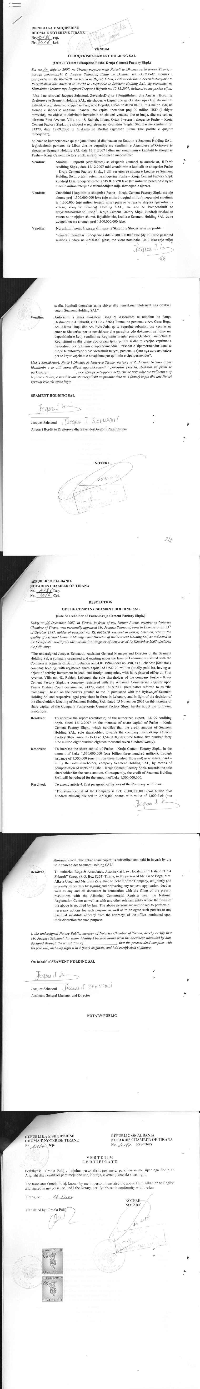 pengedhenesit Raiffeisen Bank , Alpha Bank , Banka e Tiranes, Ubtesa San Paolo Bank Albania Bank, Banka Societe Generale Albania, Banka Credins per vendosjen e pengedhenesit si per nje garanci per shlyerjen e plote dhe te pakthyeshme te detyrimeve te Garantuara, me ane te ketij akti ne menyre te pakthyeshme japin peng kuotat, ne favor te kredidhenesve cdo aksion I ri I shoqerive ose te drejtat e lidhura me to qe mund te zoterohen ne te ardhmen nga barredhenesit. Depozitimi I marrveshjes kolaterali financiar Nr.3420 Rep. Nr.1491 Kol. Date 14.08.2014 ku eshte bere marveshja ku jane vendosur 100% te kolateralit te shoqerise “Fushe – Kruja Cement Factory” ne favor te kredidhenesit. II. Me date 18/06/2015, me ane te Deklaratës Noteriale, Nr.2144 Rep, Nr.966/2 Kol, datë 30.12.2014, sipas të cilës, në bazë të nenit 584 të Kodit Civil, nenit 28 të ligjit të Barrëve Siguruese dhe në përputhje me cedimin, deklaruesi jep shprehimisht miratimin e tij: A.Për zhbllokimin dhe si rrjedhojë fshirjen e regjistrimeve përkatëse nga regjistri hipotekor i barrëve hipotekore preferenciale mbi pasuritë e paluajtshme të renditura në ankeisn A të këtij dokumneti. B.P ër zhbllokimin dhe si rrjedhojë fshirjen e regjistrimeve përkatëse nga regjistri i barrëve siguruese të marrëveshjes së barrëve siguruese numër 1, të marrëveshjes së barrëve siguruese nr.2, të marrëveshjes së barrëve siguruese nr.3, të marrëveshjes së barrëve siguruese nr.4, mbi koutat e shoqërive të renditura në aneksin B të këtij dokumenti. C.Përfundimin e cedimit dhe autorizimin e autoriteve kompetente për përfundimin e cedemit mbi të drejtat përkatëse të renditura në aneksin C të këtij dokumenti. III. Me date 27/01/2017, me ane te Urdhrit, Nr. 080/3 Prot, datë : 10.01.2017, protokolluar nga QKB, me Nr. 1027 Prot, date: 24.01.2017, lëshuar nga shoqeria permbarimore “JUSTITIA”, u urdherua venia menjehere te mases se sekuestros konservative ne aktivitetet e pales debitore shoqeria “FUSHE-KRUJE CEMENT FACTORY”shpk, me NUIS K71827801E. IV. Me date 03/02/2017, me ane te Urdhrit, Nr. 196/3 Prot, datë : 25.01.2017, protokolluar nga QKB, me Nr. 1421 Prot, date: 31.01.2017, lëshuar nga shoqeria permbarimore “JUSTITIA”, u urdherua heqja menjehere te mases se sekuestros konservative ne aktivitetet e pales debitore shoqeria “FUSHE-KRUJE CEMENT FACTORY”shpk, me NUIS K71827801E. V. Me date 06/02/2017, me ane te Urdhrit Nr.193/3 Prot., datë 23.01.2017, lëshuar nga Shoqëria Permbarimore Justitia, u urdherua vendosja e menjehershme e masës së sekuestros konservative në aktivitetet e pales debitore shoqeria “FUSHE-KRUJE CEMENT FACTORY” sh.p.k, me NUIS (NIPT) - K71827801E. VI. Me date 27/04/2017, me ane te Urdhrit Nr.1011/3 Prot., datë 14.04.2017, protokolluar nga QKB me Nr.6012 Prot., date 24.04.2017, lëshuar nga Shoqëria Permbarimore Justitia, u urdherua heqja e menjehershme e masës së sekuestros konservative në aktivitetet e pales debitore shoqeria “FUSHE-KRUJE CEMENT FACTORY” sh.p.k, me NUIS (NIPT) - K71827801E. VII. Me date 17/01/2018, me ane te Urdhrit Nr.059/3 Prot., datë 05.01.2018, lëshuar nga Shoqëria Permbarimore Justitia, u urdherua vendosja e menjehershme e masës së sekuestros konservative në aktivitetet e pales debitore shoqeria “FUSHE-KRUJE CEMENT FACTORY” sh.p.k, me NUIS (NIPT) - K71827801E. VIII. Me date 26/02/2018, me ane te Urdhrit Nr. 212/3 Prot., datë 26.01.2018, lëshuar nga Shoqëria Permbarimore Justitia, u urdherua heqja e menjehershme te masës së sekuestros konservative në aktivitetet e pales debitore shoqeria “FUSHE-KRUJE CEMENT FACTORY” sh.p.k, me NUIS (NIPT) - K71827801E. IX. Me date 06/07/2018, me ane te Urdhrit Nr.1013/3 Prot., date 26.06.2018, "Per Venien e Sekuestros Konservative”, leshuar nga Shoqeria Permbarimore Private “Justitia” drejtuar QKB-se, u urdherua venia menjehere te mases se sekuestros konservative ne aktivitetet e pales debitore shoqeria “FUSHE-KRUJE CEMENT FACTORY” sh.p.k., me NIPT- K71827801E. X. Me date 18/07/2018, me ane te Urdhrit Nr.1104/3 Prot., date 10.07.2018, "Per Heqjen e mases se Sekuestros Konservative”, leshuar nga Shoqeria Permbarimore Private “Justitia” drejtuar QKB-se, u urdherua heqja menjehere te mases se sekuestros konservative ne aktivitetet e pales debitore shoqeria “FUSHE-KRUJE CEMENT FACTORY” sh.p.k., me NIPT- K71827801E. |
