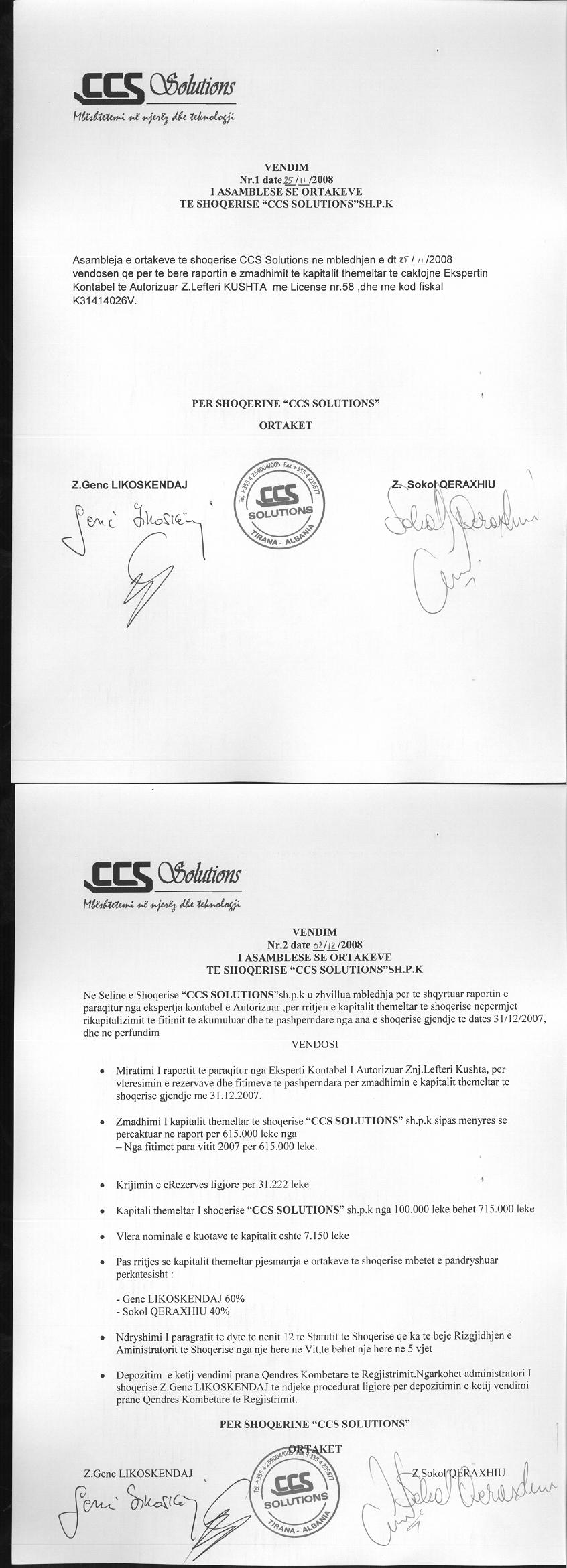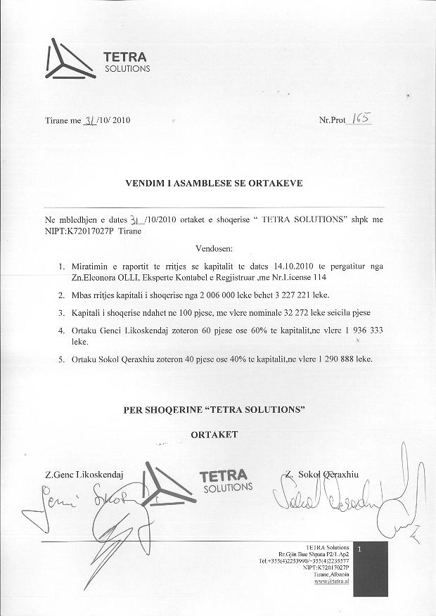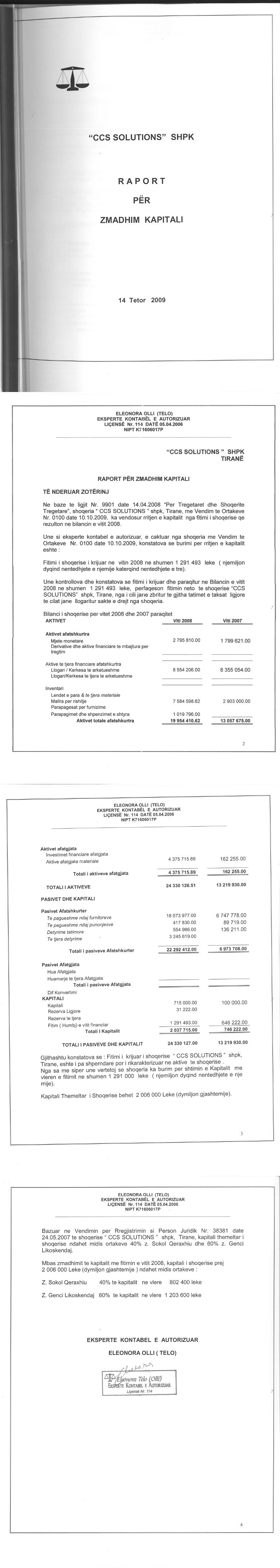 → Ekstrakt historik i regjistrit tregtar date 06.07.2022 → Akti i themelimit dhe statuti → Raport per zmadhim kapitali date 14.10.2009 → Vendimi i asamblese se ortakeve per rritjen e kapitalit date 31.10.2010 → Vendimi i asamblese se ortakeve per zmadhimin e kapitalit date 25.11.2008 → Vendim i asamblese se ortakeve per zmadhimin e kapitalit te shoqerise date 06.04.2021 → Vendimi i asamblese se ortakeve per zmadhimin e kapitalit date 17.12.2012 |
