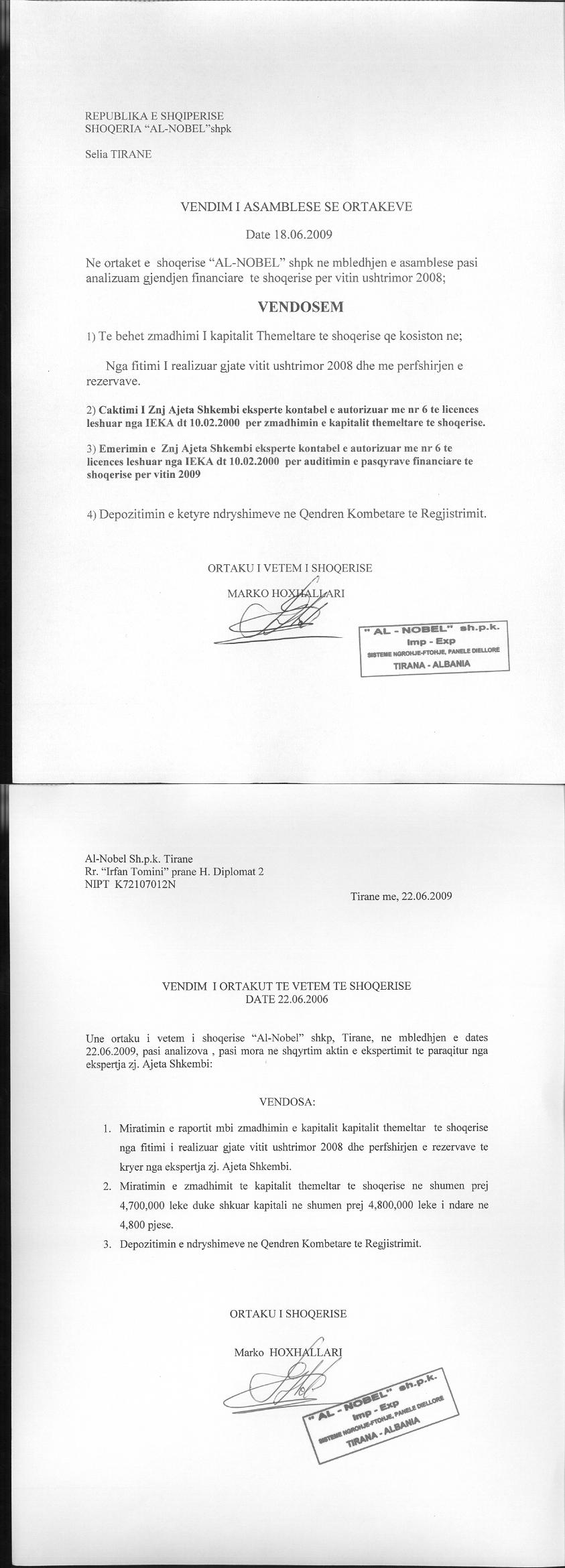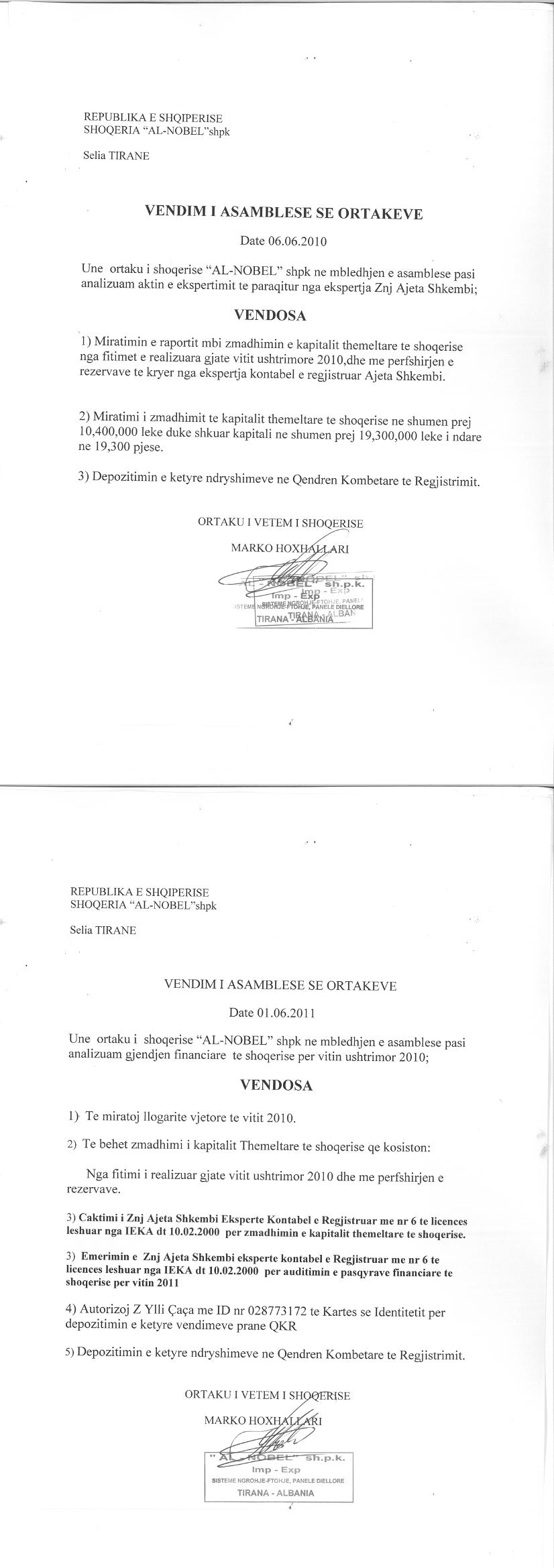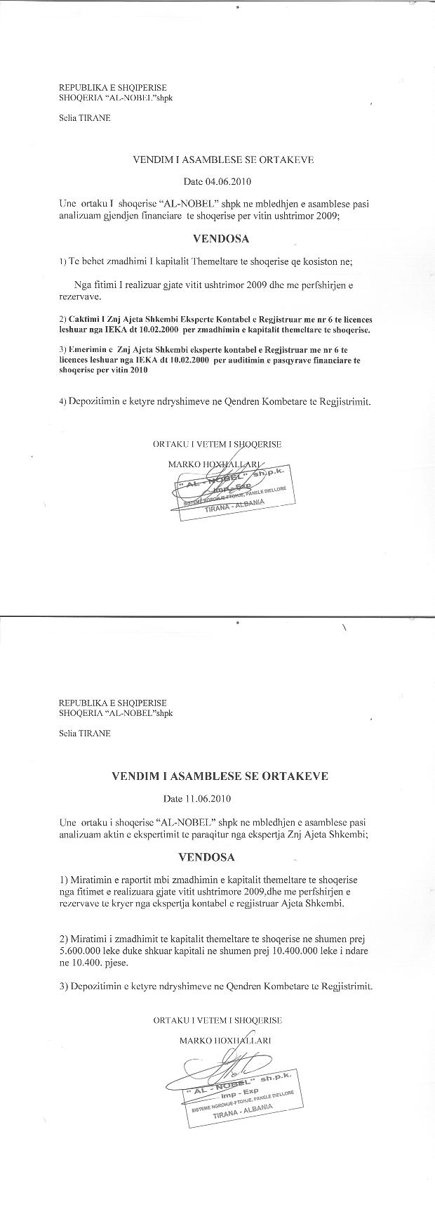 → Ekstrakti Historik i Regjistrit Tregtar date 14.02.2022 → Akti i themelimit te Shoqerise → Vendim i ortakut te vetëm te shoqërisë date 22.06.2009 → Vendim i asamblese se ortakeve date 11.06.2010 → Vendim i asamblese se ortakeve date 01.06.2011 → Vendim i asamblese se ortakeve date 23.06.2012 → Vendim i ortakut te vetëm te shoqërisë date 25.06.2014 → Vendim i ortakut te vetëm te shoqërisë date 23.06.2015 → Vendim i ortakut te vetëm te shoqërisë date 20.06.2016 → Vendim i asamblese se ortakeve date 26.06.2017 |