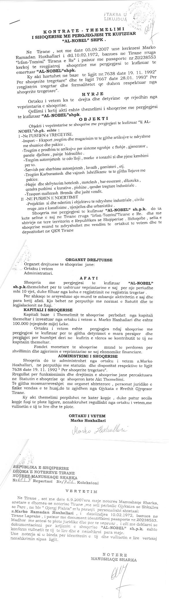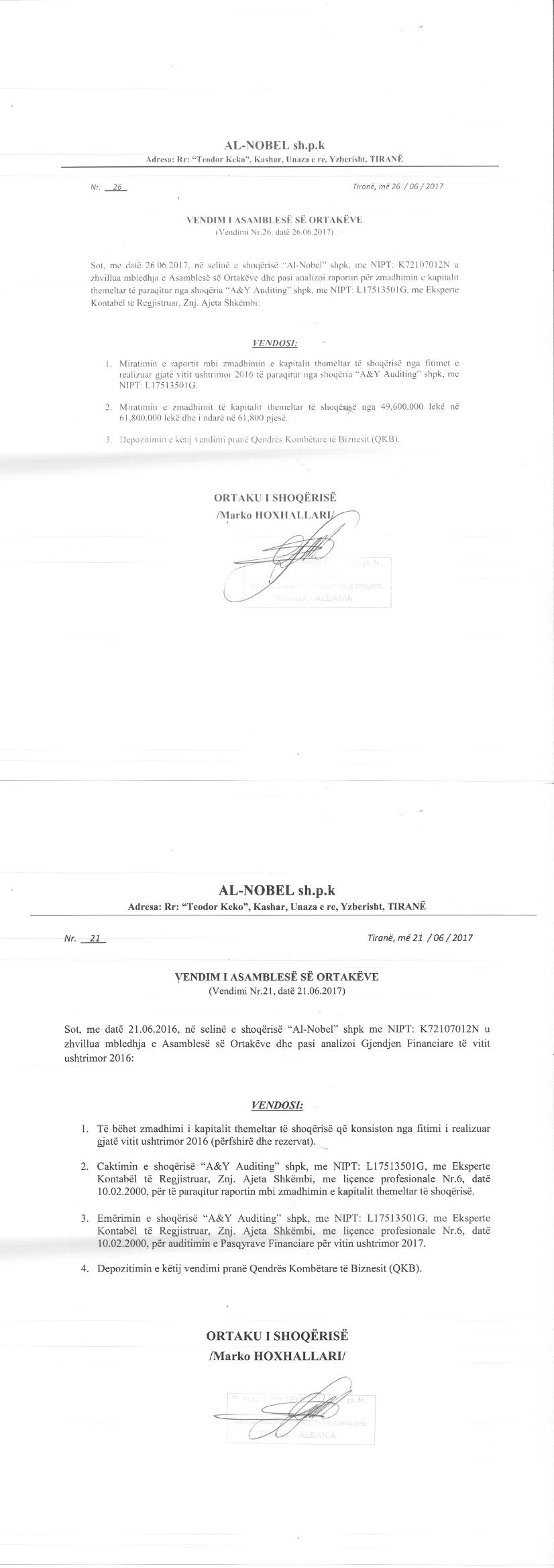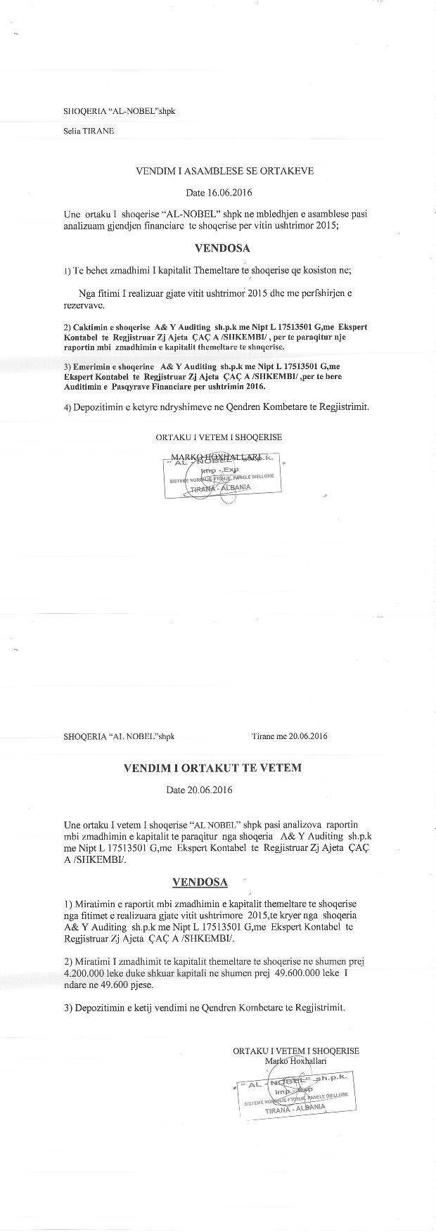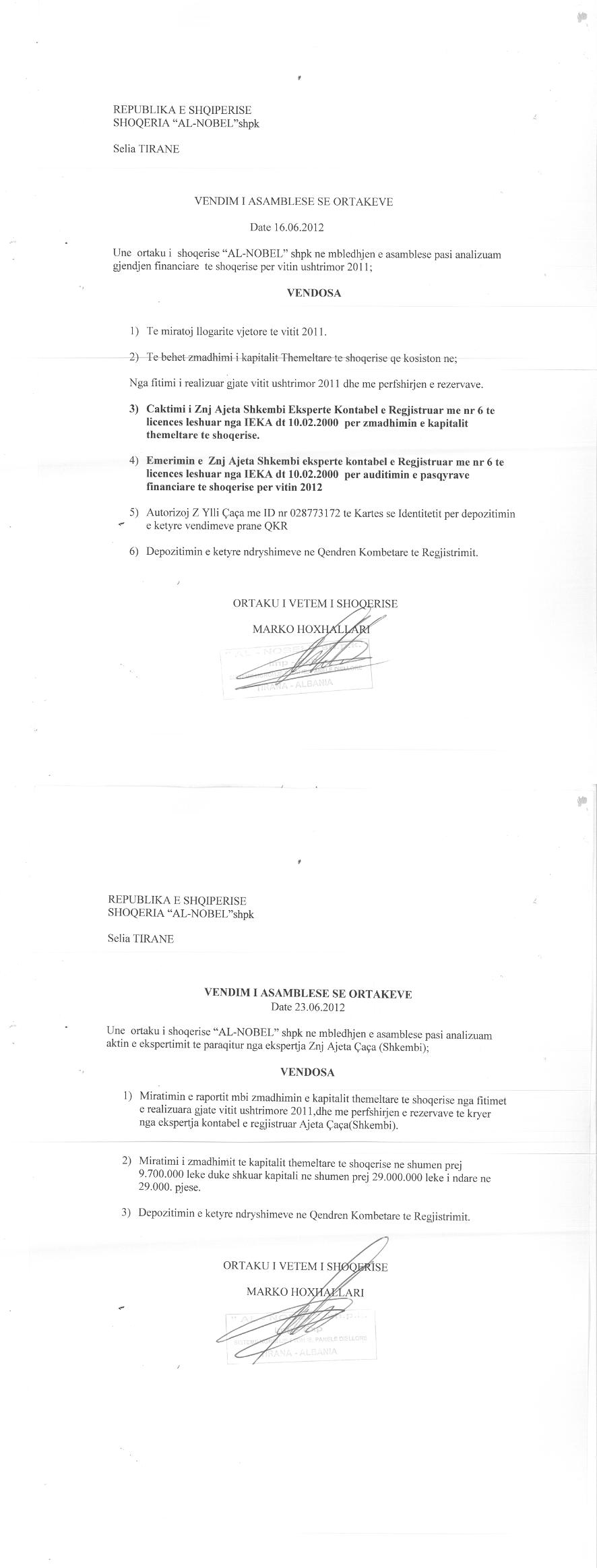 → Ekstrakti Historik i Regjistrit Tregtar date 14.02.2022 → Akti i themelimit te Shoqerise → Vendim i ortakut te vetëm te shoqërisë date 22.06.2009 → Vendim i asamblese se ortakeve date 11.06.2010 → Vendim i asamblese se ortakeve date 01.06.2011 → Vendim i asamblese se ortakeve date 23.06.2012 → Vendim i ortakut te vetëm te shoqërisë date 25.06.2014 → Vendim i ortakut te vetëm te shoqërisë date 23.06.2015 → Vendim i ortakut te vetëm te shoqërisë date 20.06.2016 → Vendim i asamblese se ortakeve date 26.06.2017 |