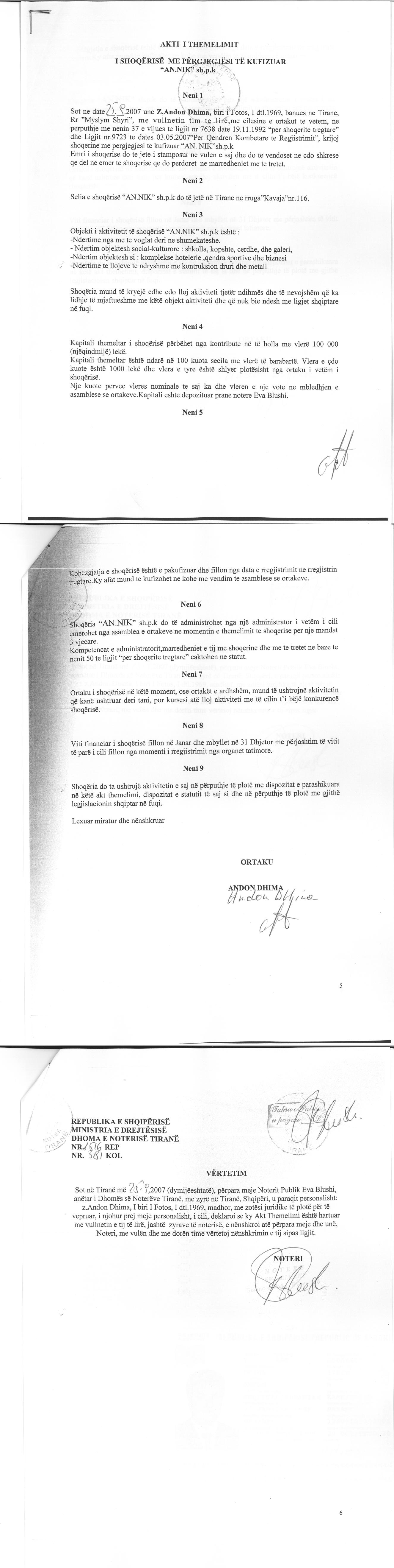 Statusi i shoqërisë ishte "Aktiv" u be "Pezulluar". II. Me datë 14.08.2019, me vendim të asamblesë së përgjithshme, u vendos aktivizimi i aktivitetit. Statusi i shoqërisë ishte "Pezulluar" u be "Aktiv". III. Me datë 06.12.2021, në bazë të shkresës nr. 17503 Prot., për Vendosjen e Mases se Sigurimit te Detyrimit Tatimor, lëshuar nga Drejtoria e Pergjithshme e Tatimeve Tirane (Rajoni Qëndror), u kërkua: Të mos lejohet tjetërsimi mbi pasurine dhe te drejtat pasurore qe i perkasin subjektit “AN.NIK” SHPK, pajisur me NUIS (NIPT)- K72214001N, deri ne shlyerjen e detyrimeve tatimore. IV. Me datë 01.02.2022, me vendim të asamblesë së përgjithshme, u vendos Pushimi i Perkohshem i Aktivitetit pa afat nga data 01.02.2022. Statusi i shoqërisë ishte "Aktiv" u be "Pezulluar". V. Me datë 05.03.2025, me vendim të asamblesë së ortakëve, u miratua prishja e shoqërisë dhe fillimi i procedurave të likuidimit. Likuidues i shoqërisë u emërua z. Ergys Demneri. Statusi i shoqërisë ishte ishte "Pezulluar" u be "Shoqeri ne Likuidim e Siper". |