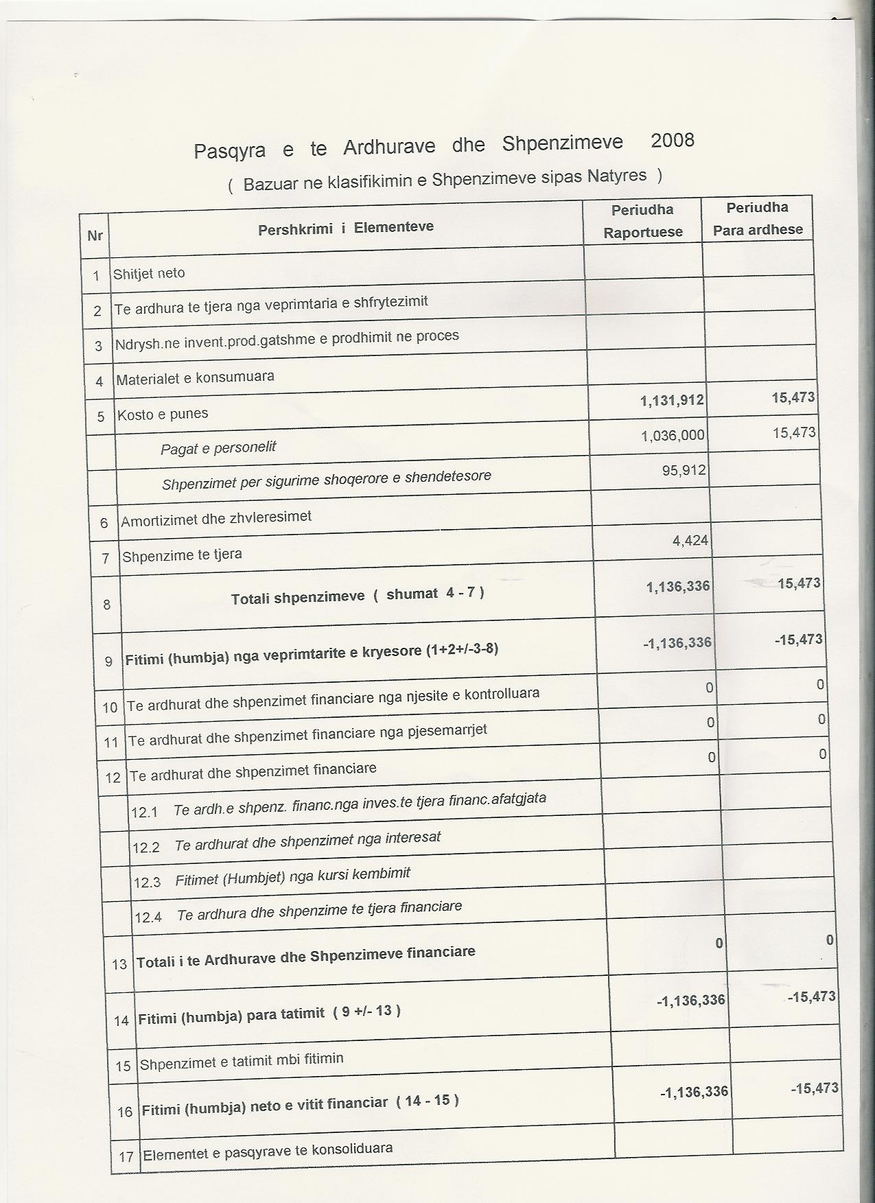 -43 420,00 Fitimi para Tatimit(Lekë) 2014: -100 876,00 Fitimi para Tatimit(Lekë) 2013: 3 584 712,00 Fitimi para Tatimit(Lekë) 2012: 2 962 929,00 Fitimi para Tatimit(Lekë) 2011: 4 163 558,00 Fitimi para Tatimit(Lekë) 2008: -1 136 336,00 Fitimi para Tatimit(Lekë) 2007: -15 473,00 |