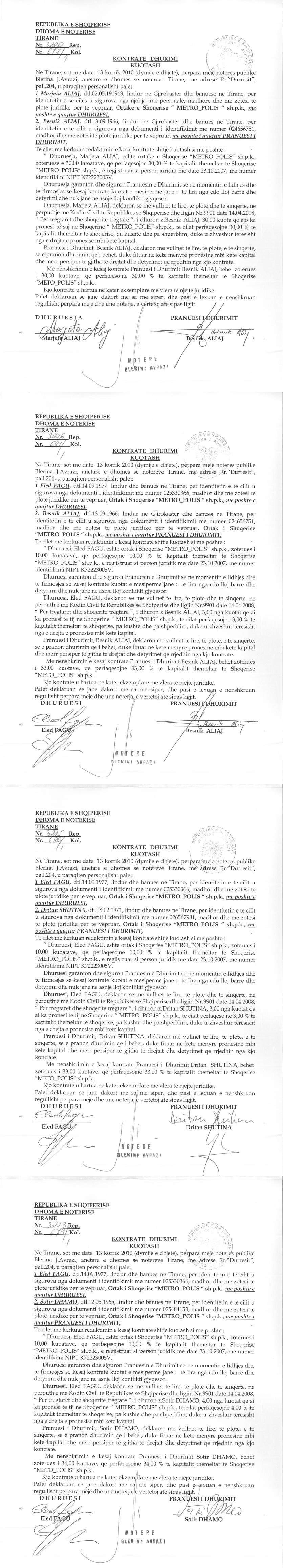 → Ekstrakt historik i regjistrit tregtar 06.01.2022 → Akti i themelimit → Kontrate dhurimi kuotash 13.07.2010 → Vendimi per zmadhimin e kapitalit 30.12.2010 → Vendim i asamblese se ortakeve per rritjene e kapitalit 22.11.2010 → Vendim i asamblese se ortakeve per rritjen e kapitalit 10.10.2013 |