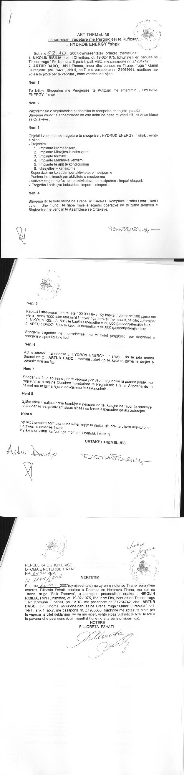 → Ekstrakt historik i regjistrit tregtar 09.11.2020 → Akti i themelimit → Vendimi i asamblese per zmadhimin e kapitalit 23.12.2012 → Urdher per venien e sekuestros konservative 20.02.2013 → Vendimi i asamblese per zmadhimin e kapitalit 24.09.2015 → Urdher per heqjen e mases se sekuestros 06.10.2017 |