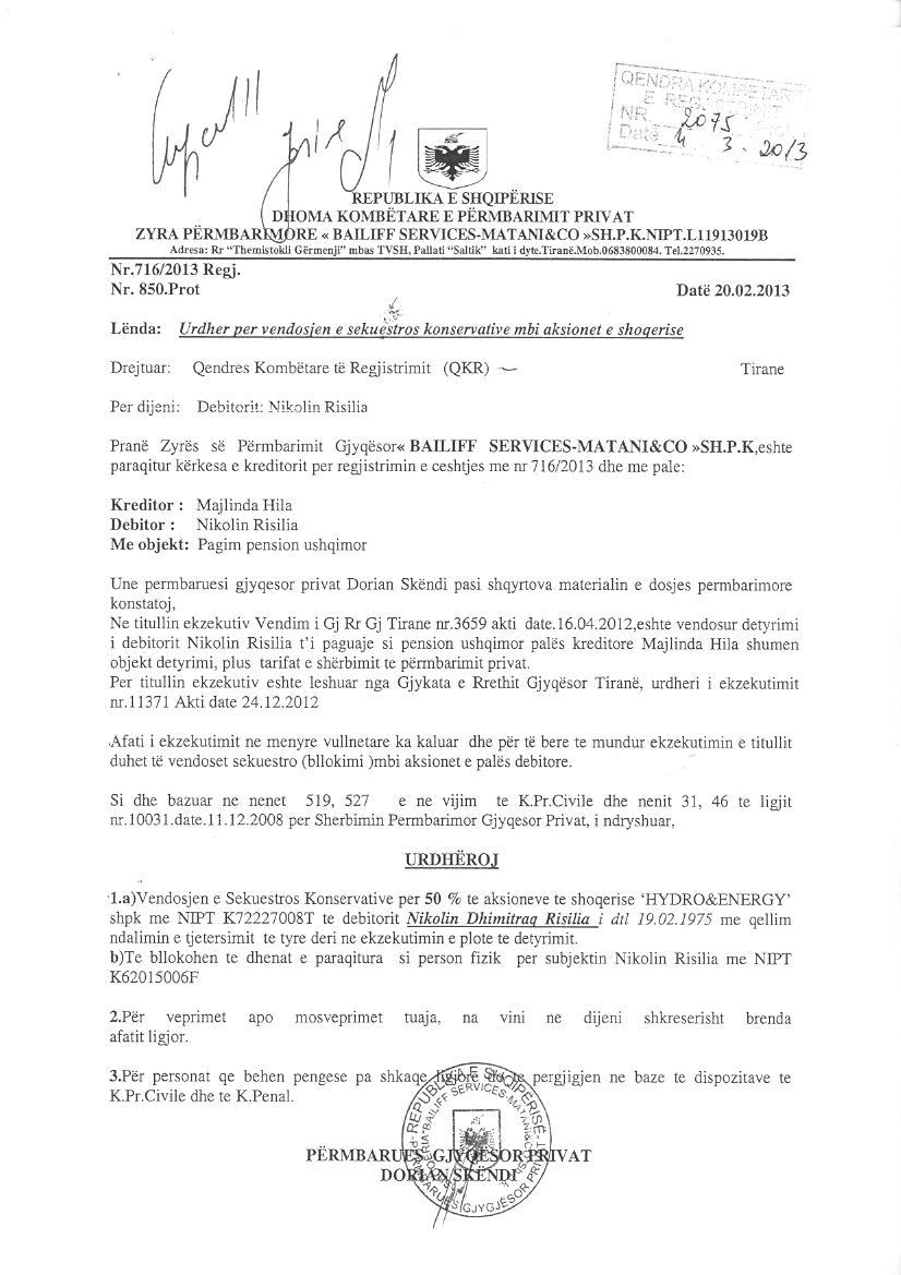 | Çështje Ligjore: | I. Më datë 20.02.2013, me anë të Urdhrit Nr. 716/2013 Regj., Nr.850 Prot., lëshuar nga Zyra Përmbarimore “Bailiff Services-Matani & Co” sh.p.k., u urdhërua vendosja e sekuestros konservative për 50% të aksioneve të shoqërisë “HYDRO&ENERGY” sh.p.k, të debitorit Nikolin Risilia, me qëllim ndalimin e tjetërsimit të tyre deri në ekzekutimin e plotë të detyrimit”. II. Më datë 06.10.2017, me anë të Urdhërit Nr. 2523 Prot., lëshuar nga shoqëria përmbarimore "Bailiff Services-Matani & Co" Shpk, u hoq masa e sekuestros konservative mbi 50 % të aksioneve (kuotave) të shoqërisë "Hydro&Energy" shpk, në pronësi të debitorit Nikolin Risilia, të vendosur me anë të shkresës Nr. 716. Dosje/ Nr. 850.Prot., datë 20.02.2013. Heqja e sekuestros u ndërmor pas shlyerjes së detyrimeve të prapambetura ndaj kreditorit Majlinda Hita. |
