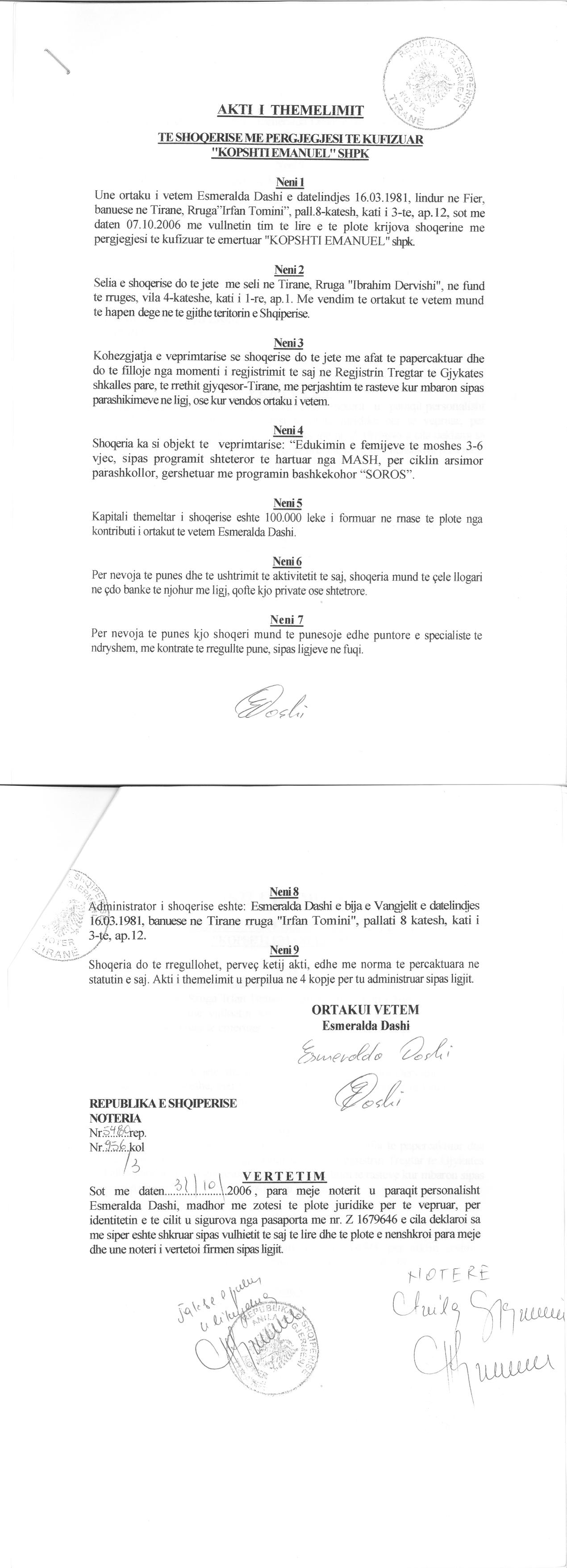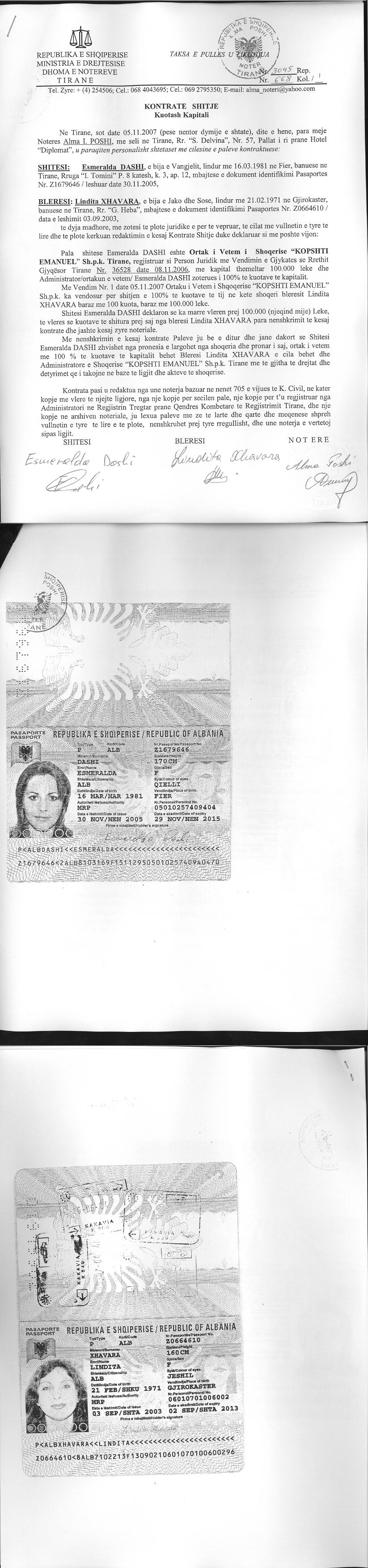 → Ekstrakti Historik i Regjistrit Tregtar date 08.07.2022 → Akt themelimi i Shoqerise → Kontrate Shitje Kuotash date 05.11.2007 → Kontrate Shitje Kuotash date 10.09.2016 → Kontrate Shitje Kuotash date 06.10.2016 |