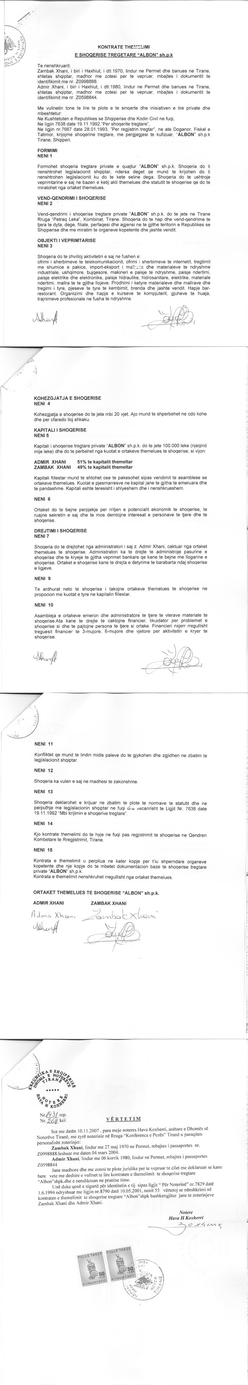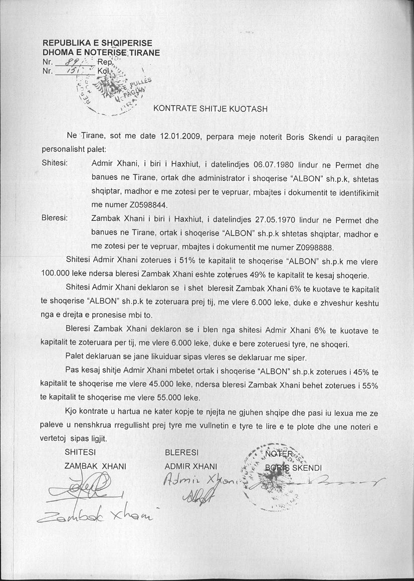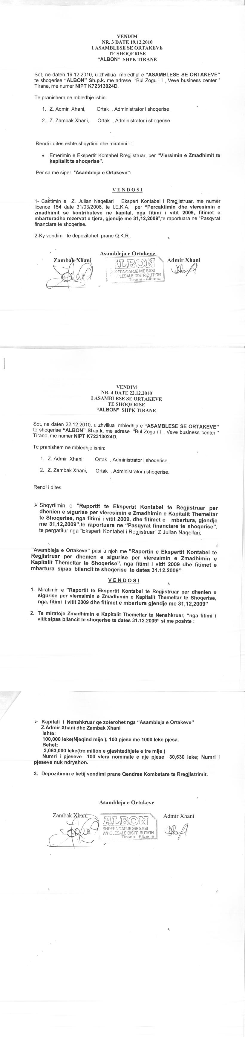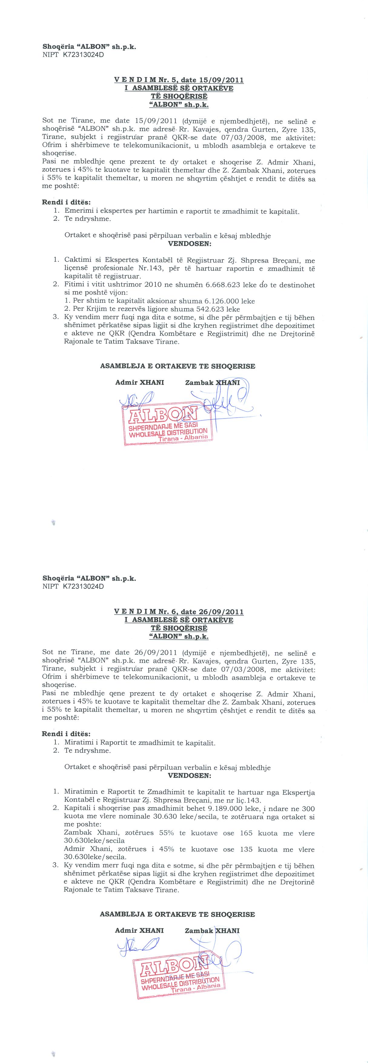 → Ekstrakti Historik i Regjistrit Tregtar date 02.10.2021 → Akti i themelimit te Shoqerise → Kontrate e Shitjes se Kuotave date 12.01.2009 → Vendim i Asamblese se Pergjithshme per rritjen e kapitalit date 19.02.2010 → Vendim i Asamblese se Pergjithshme per rritjen e kapitalit date 15.09.2011 |