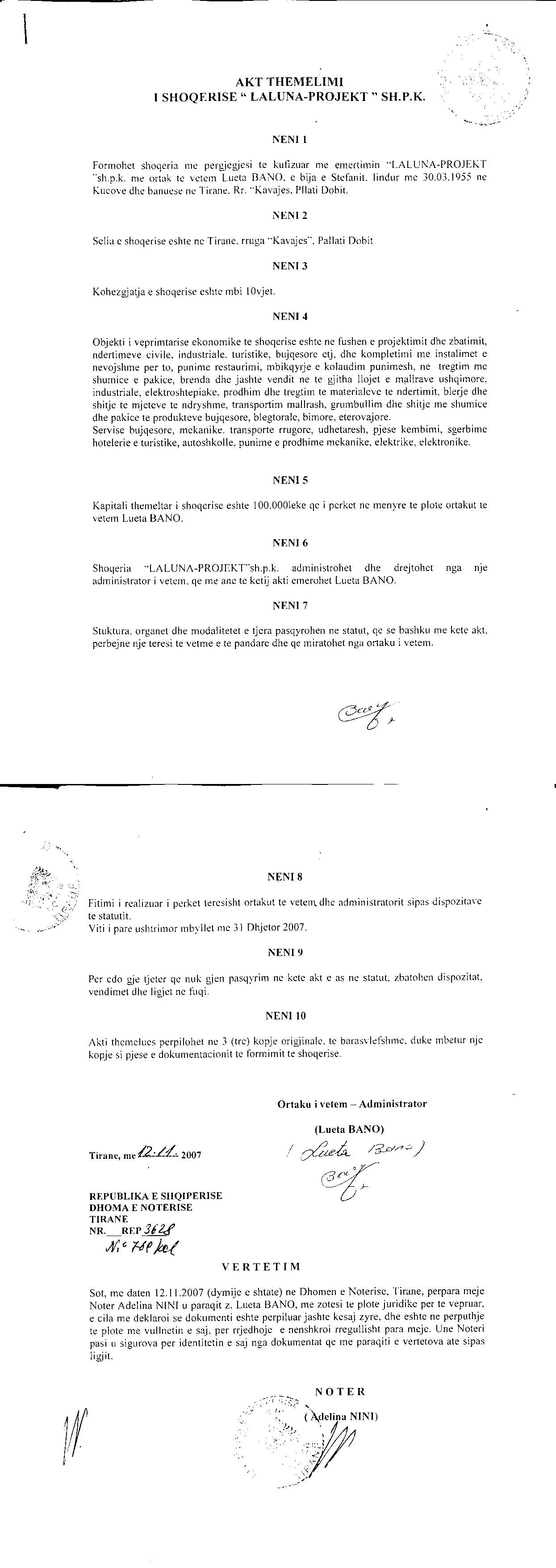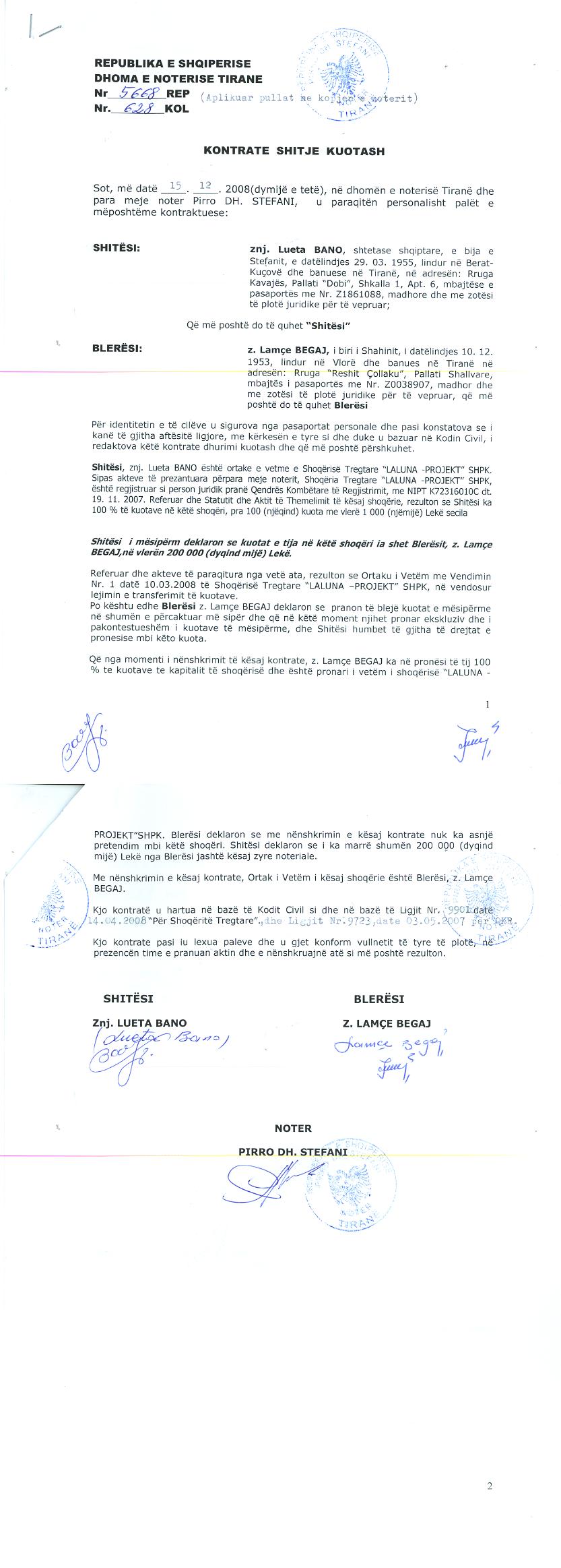 → Ekstrakt historik i regjistrit tregtar date 23.08.2021 → Akti i themelimit → Ekstrakt Historik i Regjistrit Tregtar date 19.07.2023 → Kontratë Shitje Kuotash datë 15.12.2008 |