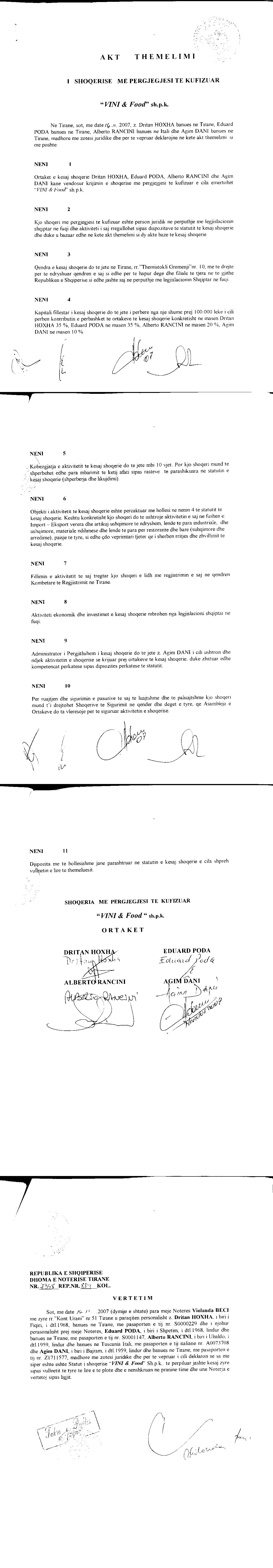 → Ekstrakt Historik i Regjistrit Tregtar date 24.03.2023 → Akt themelimi i Shoqerise → Vendim trashëgimie → Ekstrakt Historik i Regjistrit te Pronareve Perfitues date 24.03.2023 |