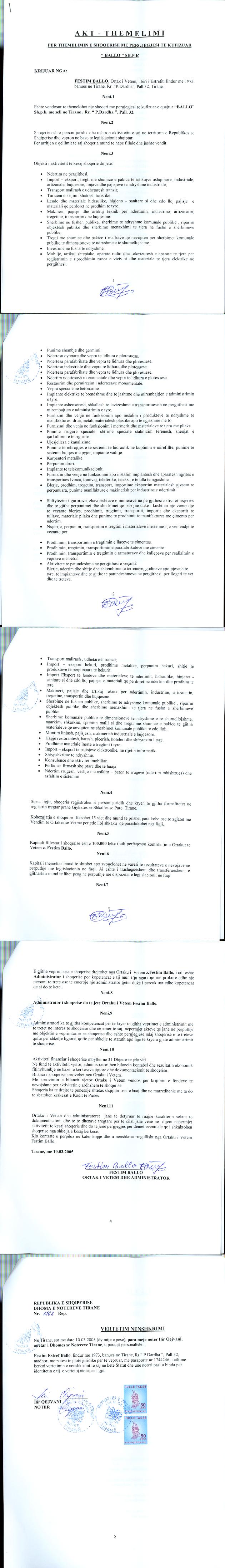 | Objekti i Veprimtarisë: | Import-eksport tregti me shumice e pakice te artikujve ushqimore, industriale, artizanale, bujqesore, linjave dhe pajisje te ndryshme industriale.Transport mallrash e udhetaresh.Turizem e krijim fshatrash turistike.Lende dhe materiale hidraulike, higjeno sanitare.Makineri, pajisje dhe artikuj teknike per ndertimin, industrine, artizanatin, tregtine, transportin dhe bujqesine.Sherbime ne fushen publike, sherbime te ndryshme komunale publike.Tregti me shumice e pakice i mallrave qe nevojiten per sherbimet publike.Punime shembje dhe germimin.Ndertesa qytetare dhe vepra te lidhura plotesuese.Restaurim ndertesash monumentale, ndertesa parafabrikate dhe vepra te lidhura plotesuese.Impiante elektrike te brendshme e te jashtme.Impiante asensoresh, shkallesh te levizshme e transportuesish.Furnizim dhe venie ne funksionim apo instalim i produkteve te ndryshme te manifaktures.Punikme rrugore speciale, ujesjellesa e kanalizime, karpenteri metalike, perpunim druri, blerje prodhim, tregtim, transport, importim e eksportim materialesh gjysem te perpunuara. Nxjerrje, perpunim, transportim dhe tregtim i mallrave inerte. Import-eksport hekuri, prodhime metalike, perpunim hekuri, shitje te produketev te perpunuara te hekurit. Montim linjash, pajisjesh, makinerish industriale e bujqesore.Hapje restorantesh, baresh, picerish, hoteleri.Shtypshkrime te ndryshme.Konsulence dhe aktiviett imobiliar. |
