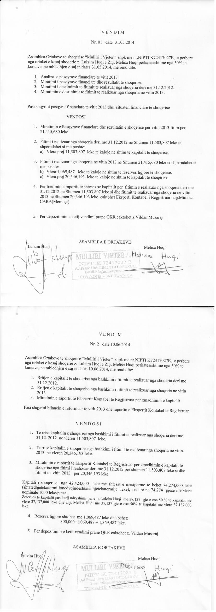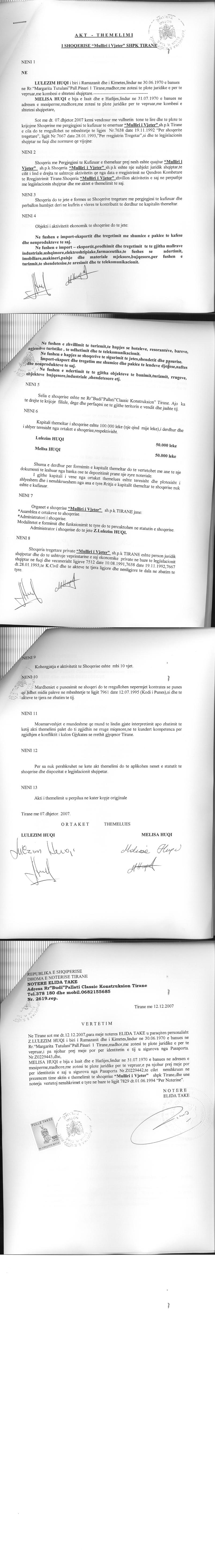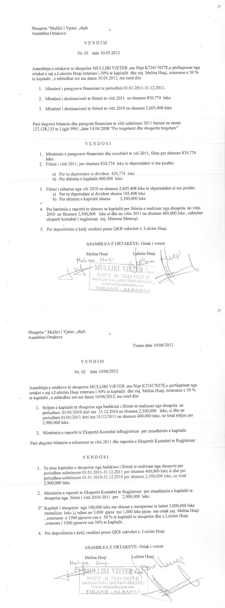 → Ekstrakti Historik i Regjistrit Tregtar date 28.07.2022 → Akt themelimi i Shoqerise → Vendim i Asamblese se Ortakeve, Zmadhim Kapitali date 10.06.2012 → Vendim i Asamblese se Ortakeve, Zmadhim Kapitali date 15.06.2013 → Vendim i Asamblese se Ortakeve, Zmadhim Kapitali date 10.06.2014 → Vendim i Asamblese se Ortakeve, Zmadhim Kapitali date 02.06.2015 → Vendim i Asamblese se Ortakeve, date 15.03.2019 |