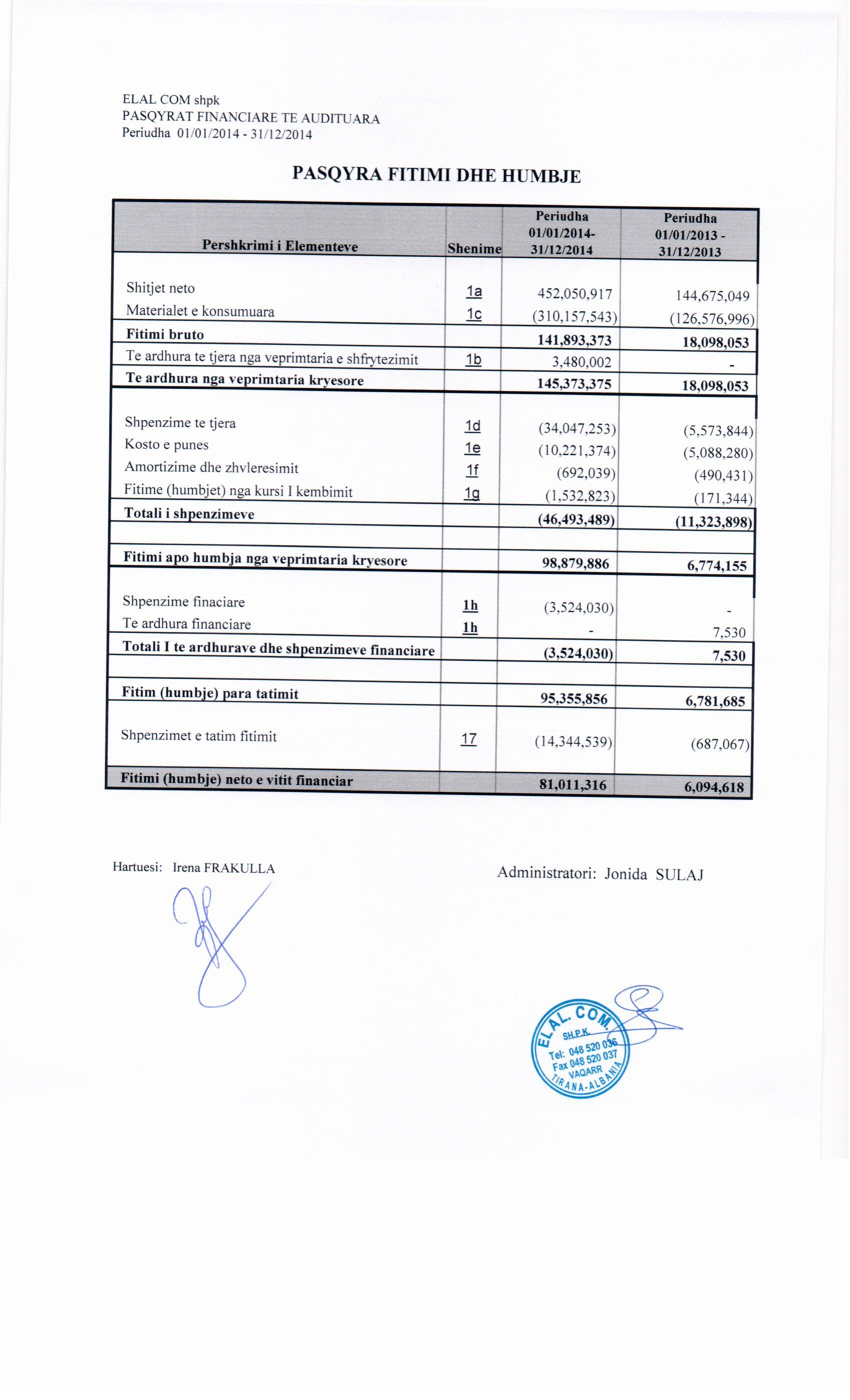 Xhiro Vjetore(Lekë) 2024:183 916 856,00 Xhiro Vjetore(Lekë) 2023:200 172 351,00 Xhiro Vjetore(Lekë) 2022:248 161 728,00 Xhiro Vjetore(Lekë) 2021:186 181 062,00 Xhiro Vjetore(Lekë) 2020:236 383 555,00 Xhiro Vjetore(Lekë) 2019:220 403 183,00 Xhiro Vjetore(Lekë) 2018:205 770 019,00 Xhiro Vjetore(Lekë) 2017:369 299 022,00 Xhiro Vjetore(Lekë) 2016:259 621 448,00 Xhiro Vjetore(Lekë) 2015:248 982 630,00 Xhiro Vjetore(Lekë) 2014: 455 530 919,00 Xhiro Vjetore(Lekë) 2013: 144 675 049,00 Xhiro Vjetore(Lekë) 2012: 91 991 665,00 |
