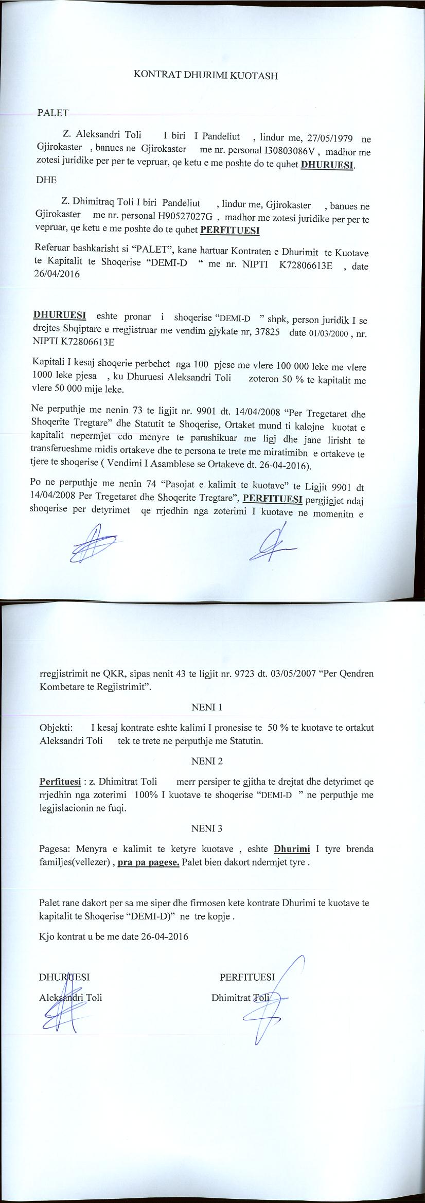→ Ekstrakti Historik i Regjistrit Tregtar date 24.05.2023 → Akt themelimi dhe Statuti i Shoqerise → Kontrate Dhurimi Kuotash date 26.04.2016 → Kontrate Dhurimi Kuotash date 10.07.2019 → Kontrate Dhurimi Kuotash date 17.08.2022 |