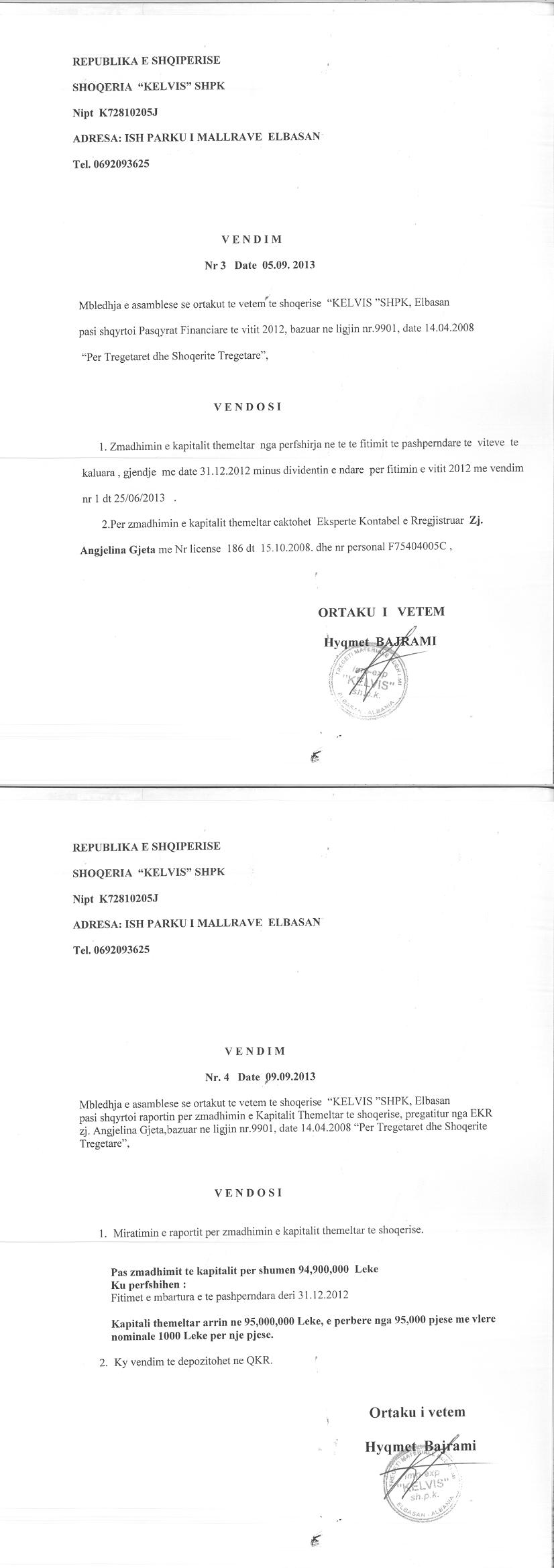 → Ekstrakt historik i regjistrit tregtar date 16.12.2021 → Statuti dhe akti i themelimit → Vendimi i ortakut te vetem per zmadhimin e kapitalit date 05.09.2013 |