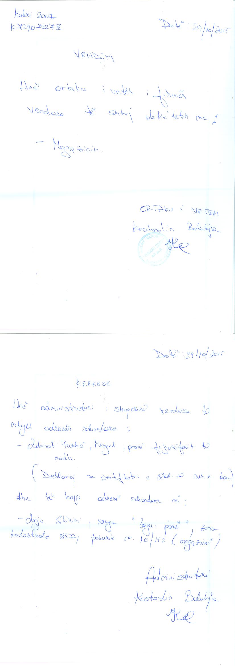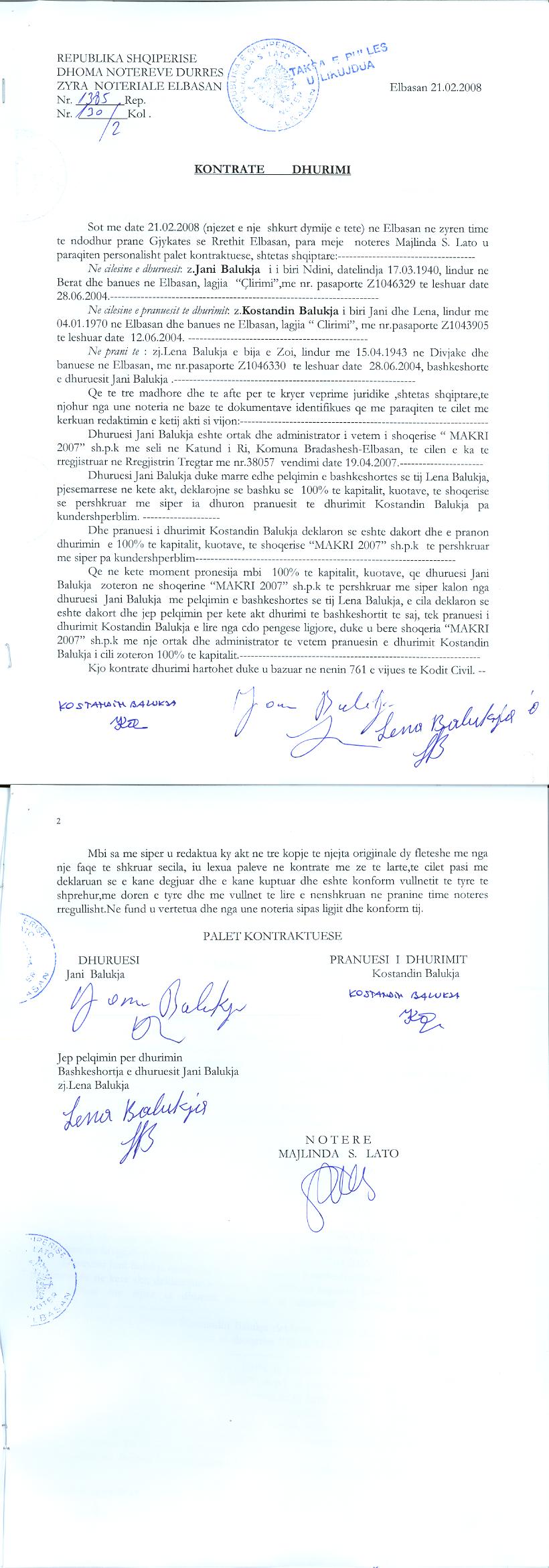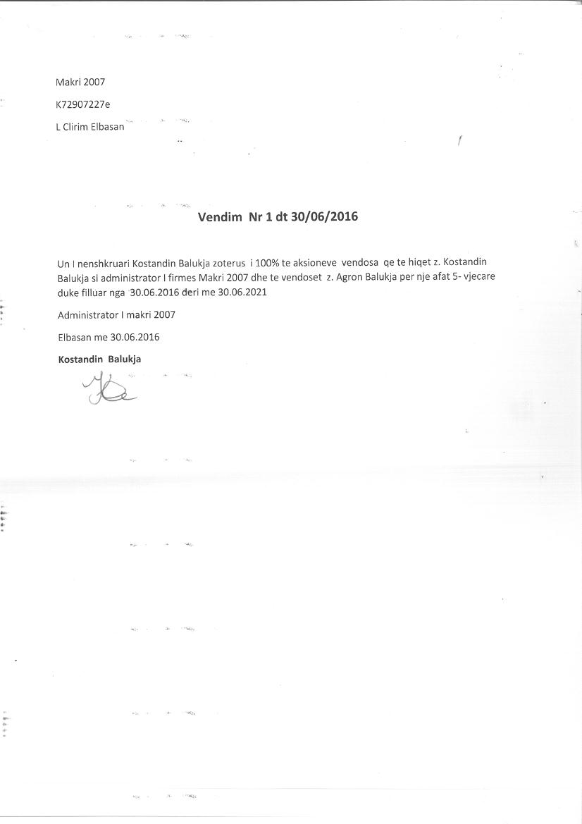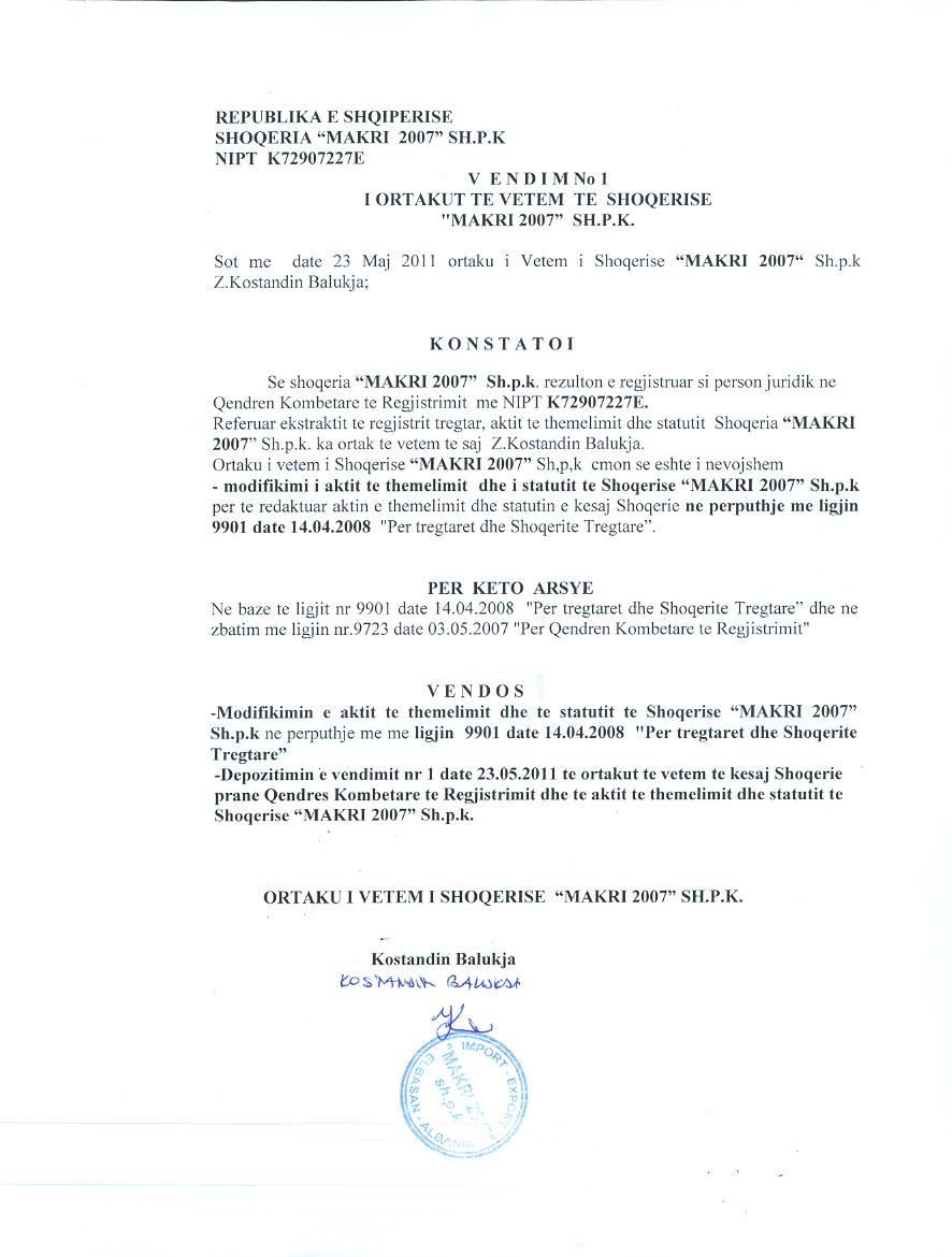 → Ekstrakt Historik i Regjistrit Tregtar te shoqerise, date 24.12.2021 → Dokumenta te ndryshem nder vite. → Kontrate Dhurimi Kuotash, date 21.02.2008 → Vendimi i Ortakut te Vetem, date 23.05.2011 → Vendimi i asamblese se pergjithshme , date 29.10.2015 → Vendimi i asamblese se pergjithshme, date 30.06.2016 → Vendimi i Ortkaut te vetem, date 2.10.2018 → Urdher-sekuestro , date 03.03.2020 → Urdher per heqjen e sekuestros 27.03.2020 → Vendimi i ortakut te vetem, date 15.07.2020 |