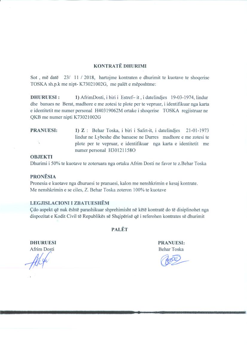 | Çështje Ligjore: | I. Më datë 29.08.2017, me anë të Urdhrit Nr. 101 Regj, Nr. 778 Prot "Urdhër për Vënien e Sekuetsros Konservative", lëshuar nga Përmbaruesi Gjyqësor Privat Besnik Dokushi, protokolluar nga QKB me Nr.12643 Prot, datë 30.08.2017, u urdhërua Qendra Kombëtare e Biznesit të bëjë verifikimin dhe bllokimin e kuotave të shoqërisë "Toska", si dhe të drejtat që rrjedhin nga zotërimi i këtyre kuotave duke ndaluar tjetërsimin dhe ose disponimin e tyre dhe moskryerjen e asnjë lloj veprimi tjetër i cili mund të ndryshojë të dhënat e regjistrit tregtar. Dokumentacioni do të qëndrojë i bllokuar deri në një urdhër të dytë nga ana jonë. Objekti i sekuestros është përmbushja e detyrimit ndaj Operatorit të Shpërndarjes së Energjisë Elektrike sh.a. II. Më datë 12.09.2017, me anë të shkresës Nr.101 Regj Nr.792 Prot., lëshuar nga Përmbaruesi Gjyqësor Privat Besnik Dokushi, protokolluar nga QKB me Nr. 13192 Prot, datë 13.09.2017, u urdhërua heqja e sekuestros konservative të vendosur për llogari të këtij detyrimi në çdo pasuri të shoqërisë "Toska", shpk me NIPT K73021002G. III. Më datë 28.05.2019, me anë të shkresës nr. 1535/5, të Drejtorisë Rajonale të Tatimeve Berat, u vendos masa e sigurimit tatimor mbi pasuritë e tatimpaguesit "TOSKA" shpk, me NIPT K73021002G duke moslejuar tjetërsimin mbi pasurinë dhe të drejtat pasurore që i përkasin këtij subjekti. IV. Më datë 22.08.2019, me anë të shkresës Nr.1535/10, të Drejtorisë Rajonale të Tatimeve Berat, u vendos zhbllokimi nga masa e sigurimit tatimor mbi pasurinë e tatimpaguesit "TOSKA" shpk, me NIPT K73021002G, meqënëse subjekti ka paguar detyrimet. |