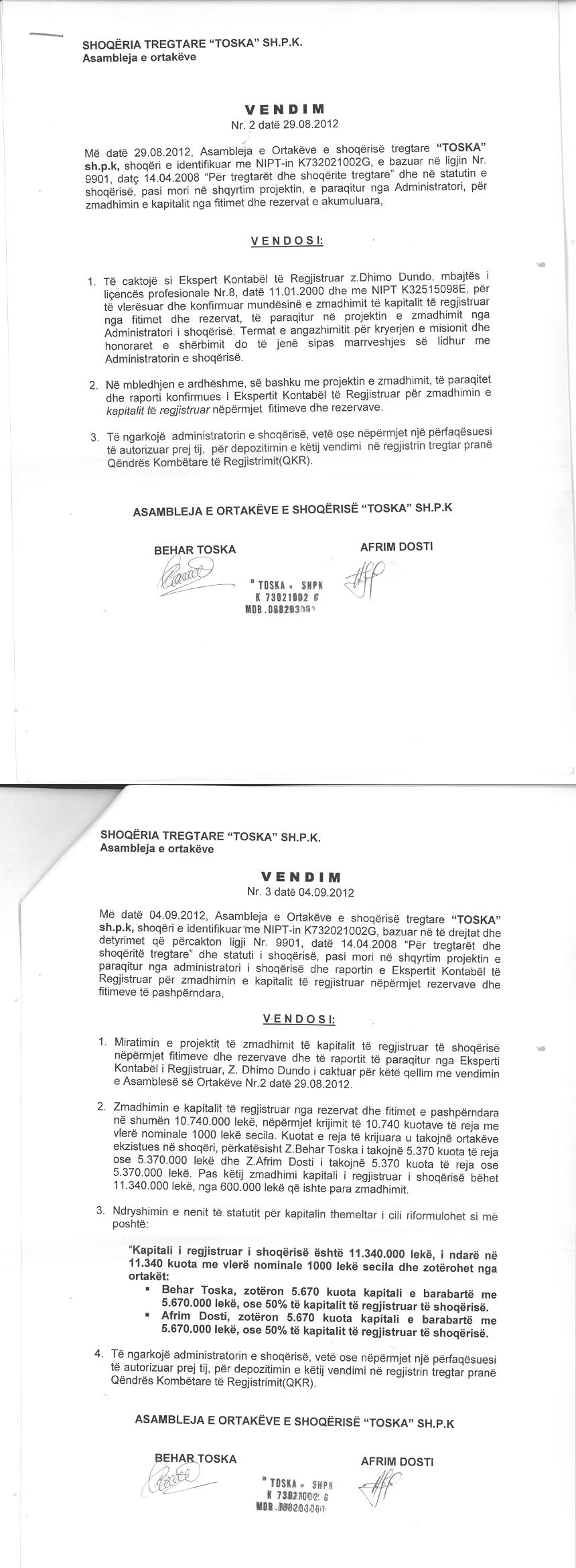 → Ekstrakt historik i regjistrit tregtar 14.12.2019 → Akti I themelimit dhe statuti → Vendimi per miratimin e projektit te zmadhimit te kapitalit 04.09.2012 → Urdher per venien e sekuestros konservative 30.08.2007 → Kontrate dhurimi 23.11.2018 |