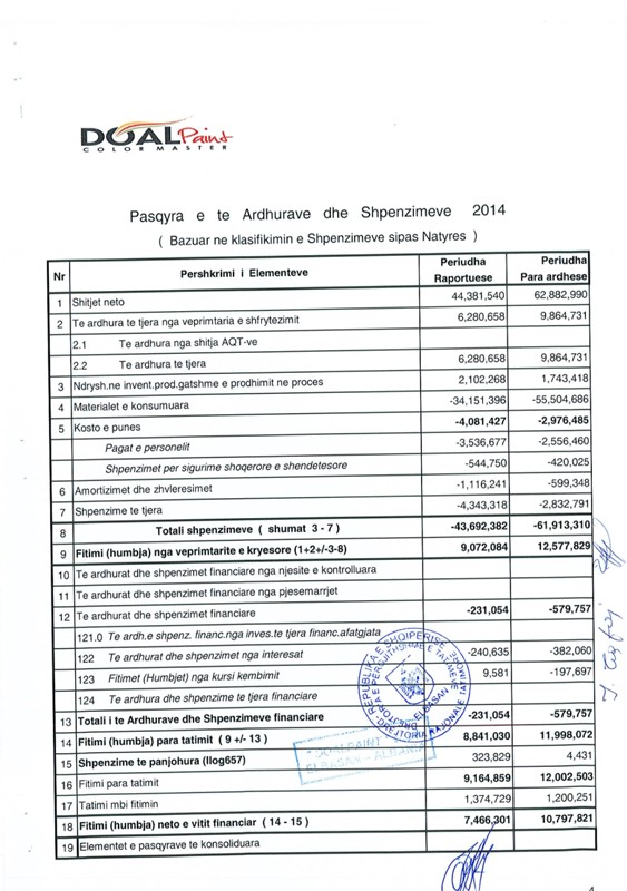1 978 786,00 Fitimi para Tatimit(Lekë) 2019: 326 807,00 Fitimi para Tatimit(Lekë) 2018: 191 634,00 Fitimi para Tatimit(Lekë) 2017: 2 118 821,00 Fitimi para Tatimit(Lekë) 2016: 6 071 822,00 Fitimi para Tatimit(Lekë) 2015: 16 086 994,00 Fitimi para Tatimit(Lekë) 2014: 9 164 859,00 Fitimi para Tatimit(Lekë) 2013: 12 002 502,00 Fitimi para Tatimit(Lekë) 2012: 5 133 618,00 Fitimi para Tatimit(Lekë) 2011: 5 036 577,00 Fitimi para Tatimit(Lekë) 2010: 3 267 091,00 Fitimi para Tatimit(Lekë) 2009: 1 961 584,00 |