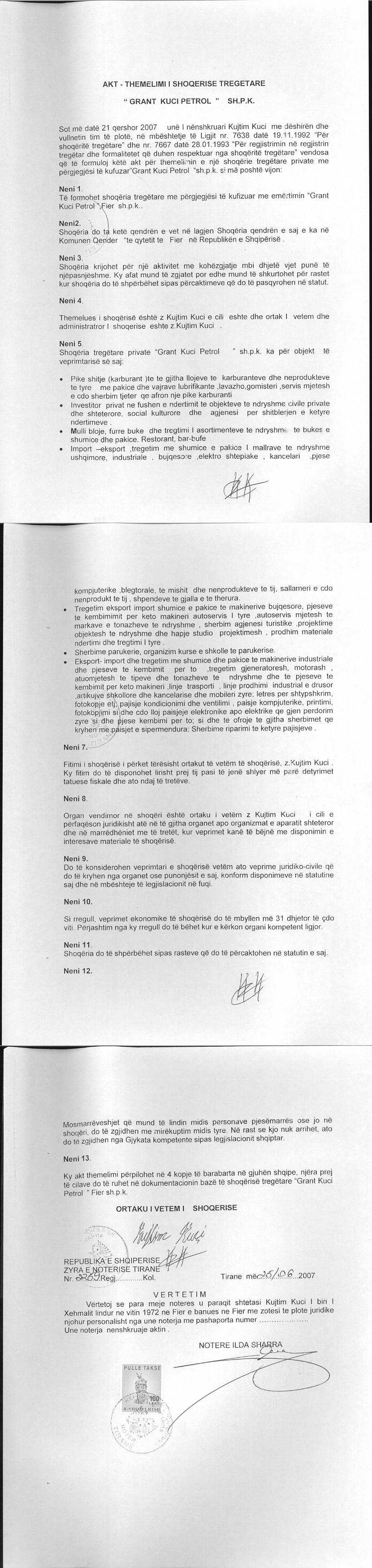 | Çështje Ligjore: | Me date 27/03/2017, me ane te Prokures Nr. 190 Rep. Nr. 55 Kol. date 09.01.2013, leshuar nga z. Kujtim Kuçi ne cilesine e administratorit te shoqerise "GRAND KUÇI PETROL" sh.p.k, mbi bazen e se ciles perfaqesuesit z. Astrit Kastrati i jepen tagrat e percaktuara ne kete akt. |