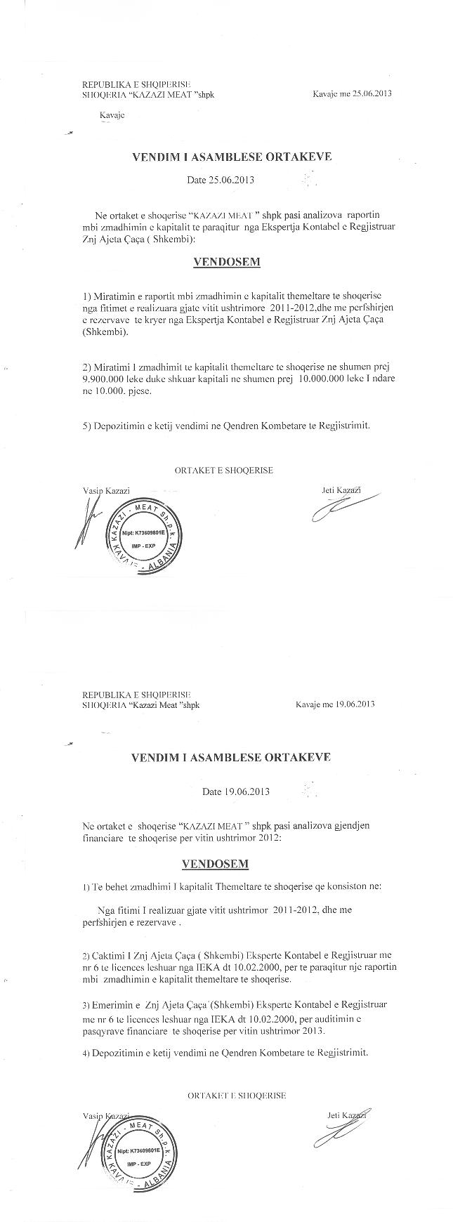 → Ekstrakti Historik i Regjistrit Tregtar date 25.10.2021 → Akti i themelimit te Shoqerise → Vendim i Asamblese se Pergjithshme per rritjen e kapitalit date 25.06.2013 → Vendim i Asamblese se Pergjithshme per rritjen e kapitalit date 01.07.2019 → Ekstrakt Historik i Regjistrit Tregtar date 13.10.2023 → Vendim i Asamblesë së Përgjithshme, Zmadhim Kapitali datë 07.07.2023 → Ekstrakt Historik i Regjistrit Tregtar date 17.04.2024 → Të dhënat e Investimit, Financimet Nga IPARD - Aksesuar nga Agjencia për Zhvillim Bujqësor dhe Rural AZHBR datë 17.04.2024 |