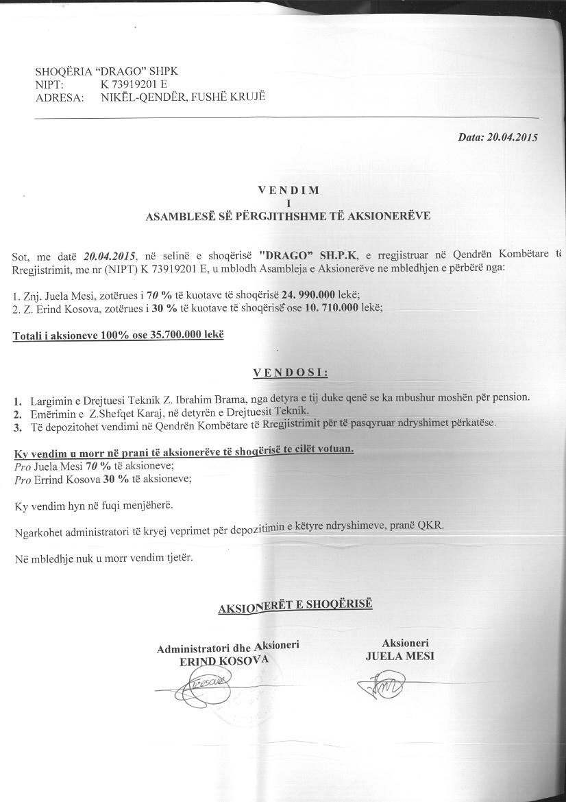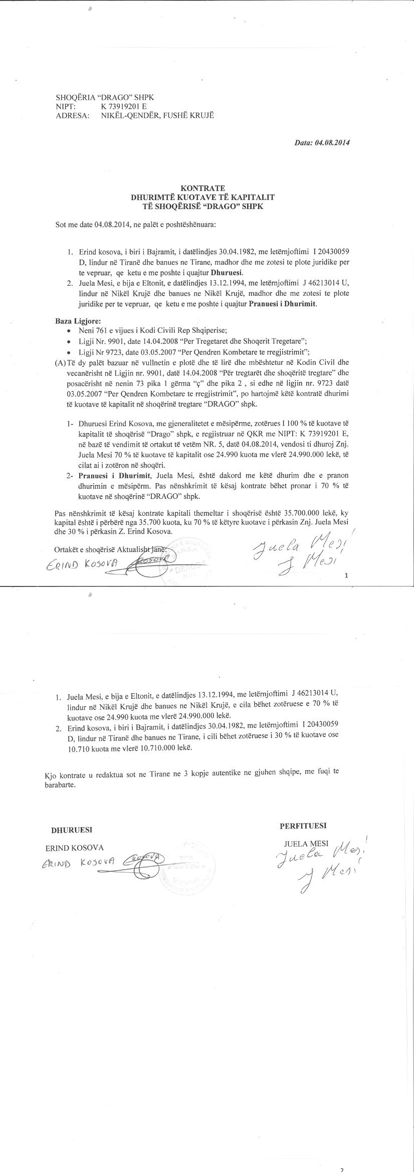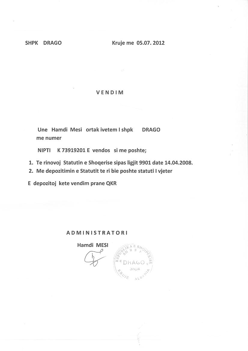 → Ekstrakt Historik i Regjistrit Tregtar, date 29.12.2021 → Dokumenta te ndryshme nder vite → Statuti i shoqerise, 05.07. 2012 → Vendimi i asamblese se ortakeve, date 05.07.2012 → Vendimi i asamblese se ortakeve, date 07.04.2014 → Kontrate Dhurimi Kotash, date 12.05.2014 → Vendimi i asamblese se ortakeve, date 09.05.2014 → Dhurimi i kuotave te kapitalit, date 04.08.2014 → Vendimi i asamblese se ortakeve, date 20.04.2015 → Vendimi i ortakut te vetem, date 18.09.2018 → Kontrate dhurimi kuotash 01.10.2015 |