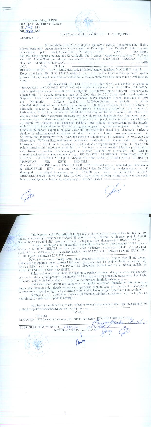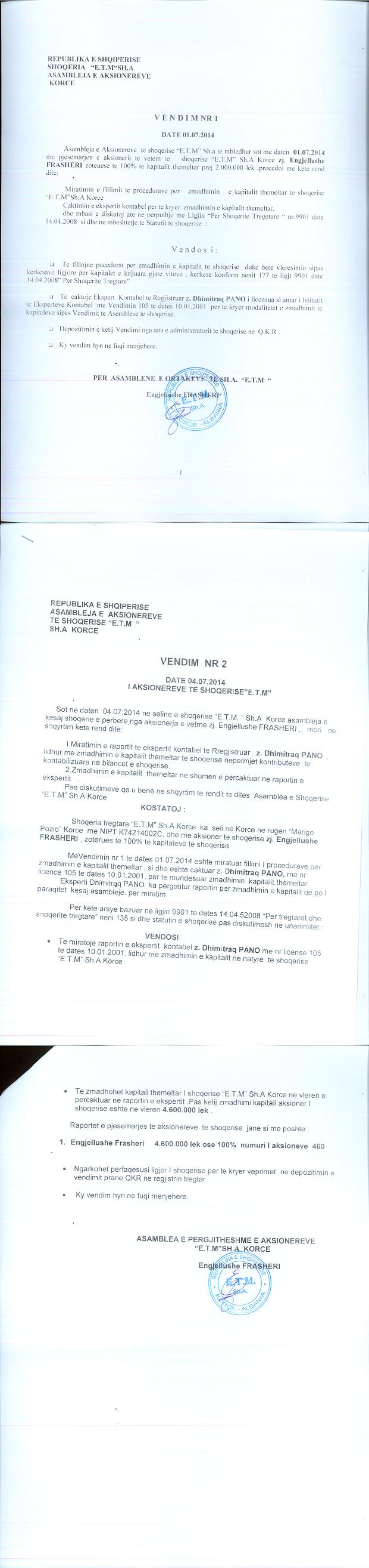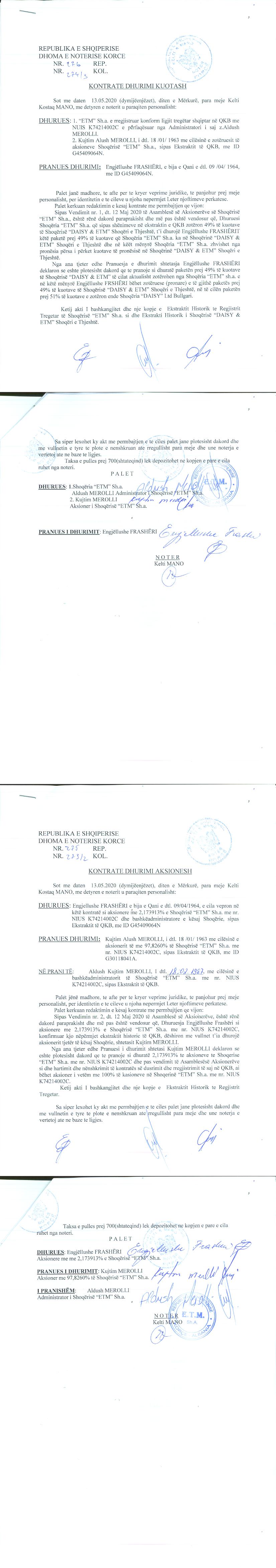 → Ekstrakt historik i regjistrit tregtar date 27.07.2022 → Akti i themelimit → Kontrate shitje aksionesh date 31.07.2015 → Kontrate dhurimi kuotash date 13.05.2020 → Kontrate shitje aksionesh date 19.09.2020 → Vendimi i asamblese se aksionareve per zmadhimin e kapitalit date 01.07.2014 → Vendimi per rifillimin e aktivitetit date 03.08.2017 |