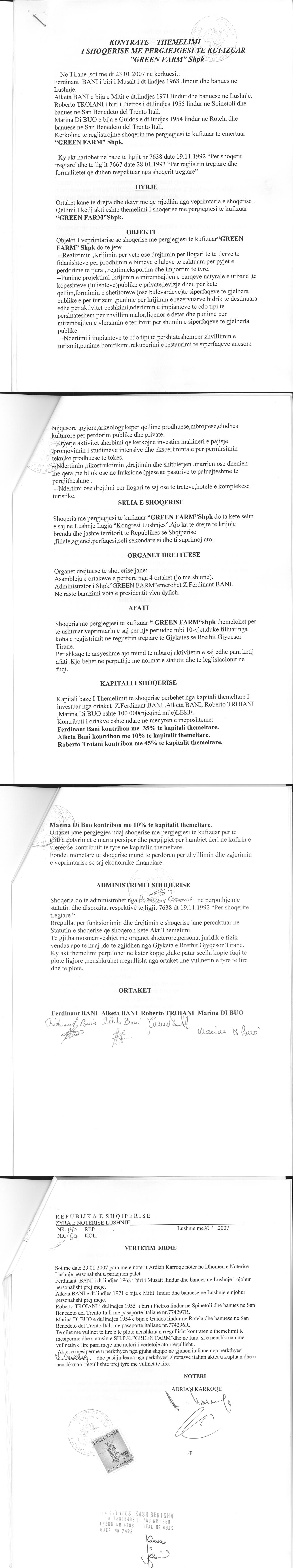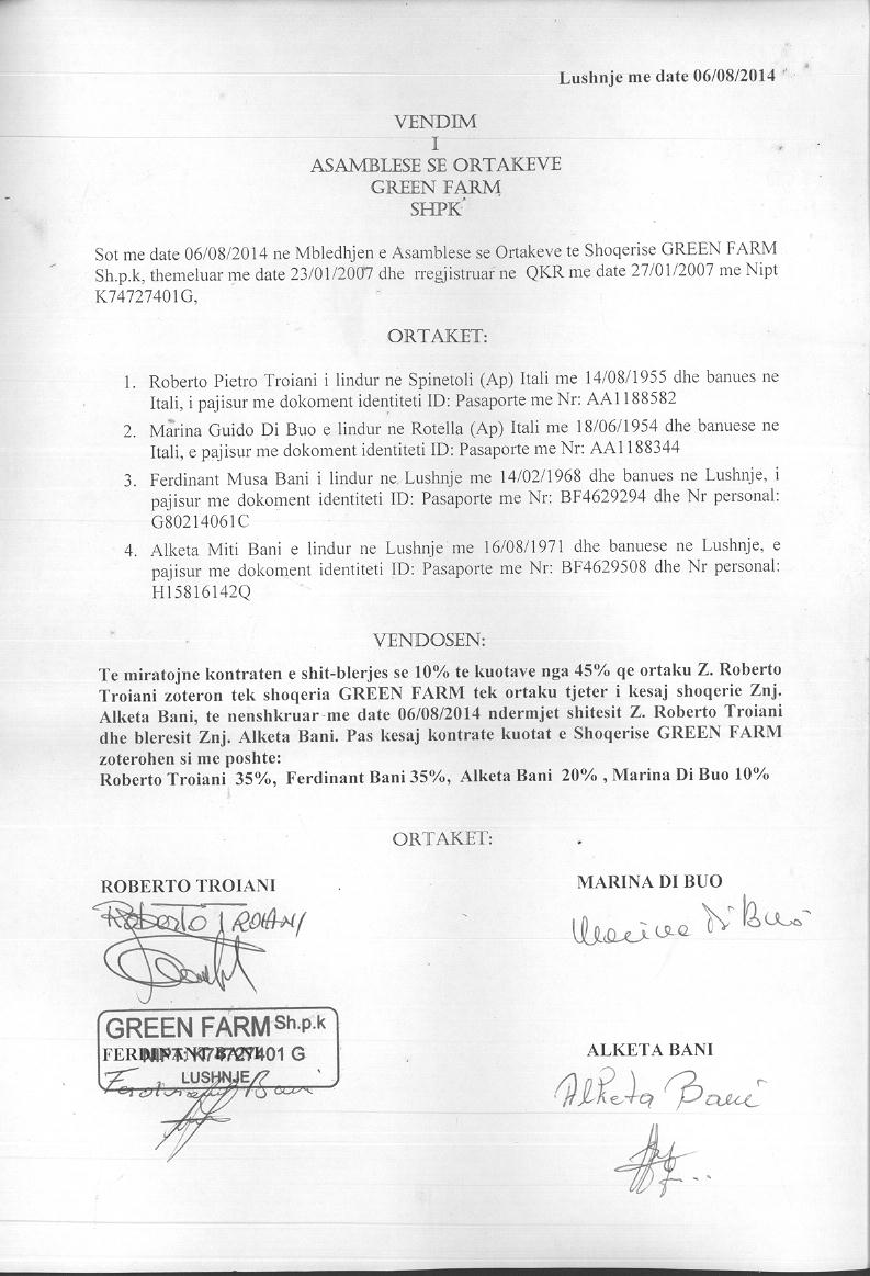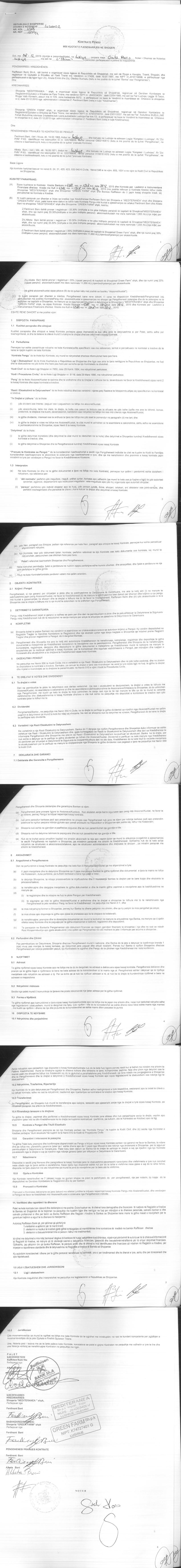 | Çështje Ligjore: | I. Me date 28.12.2015, u lidh kontrata e pengut Nr.4584 Rep. Nr.1950/4 Kol, lidhur midis pengmarresit/ kredidhenes Raiffeisen Bank sh.a dhe kredimarresit shoqeria "Mediteranea" sh.p.k dhe shoqerise "Green Farm" sh.p.k dhe pengdhenesit/ pranues te kontrates se pengut Ferdinant Bani dhe Alketa Bani. II. Me date 11.05.2018, u lidh marreveshja siguruese Nr. 1277 Rep. Nr. 646 Kol, per krijimin e barre siguruese mbi kuotat e kapitalit te shoqerise si garanci per permbushjen dhe shlyerjen e detyrimeve te siguruara te “Green Farm” shpk. |