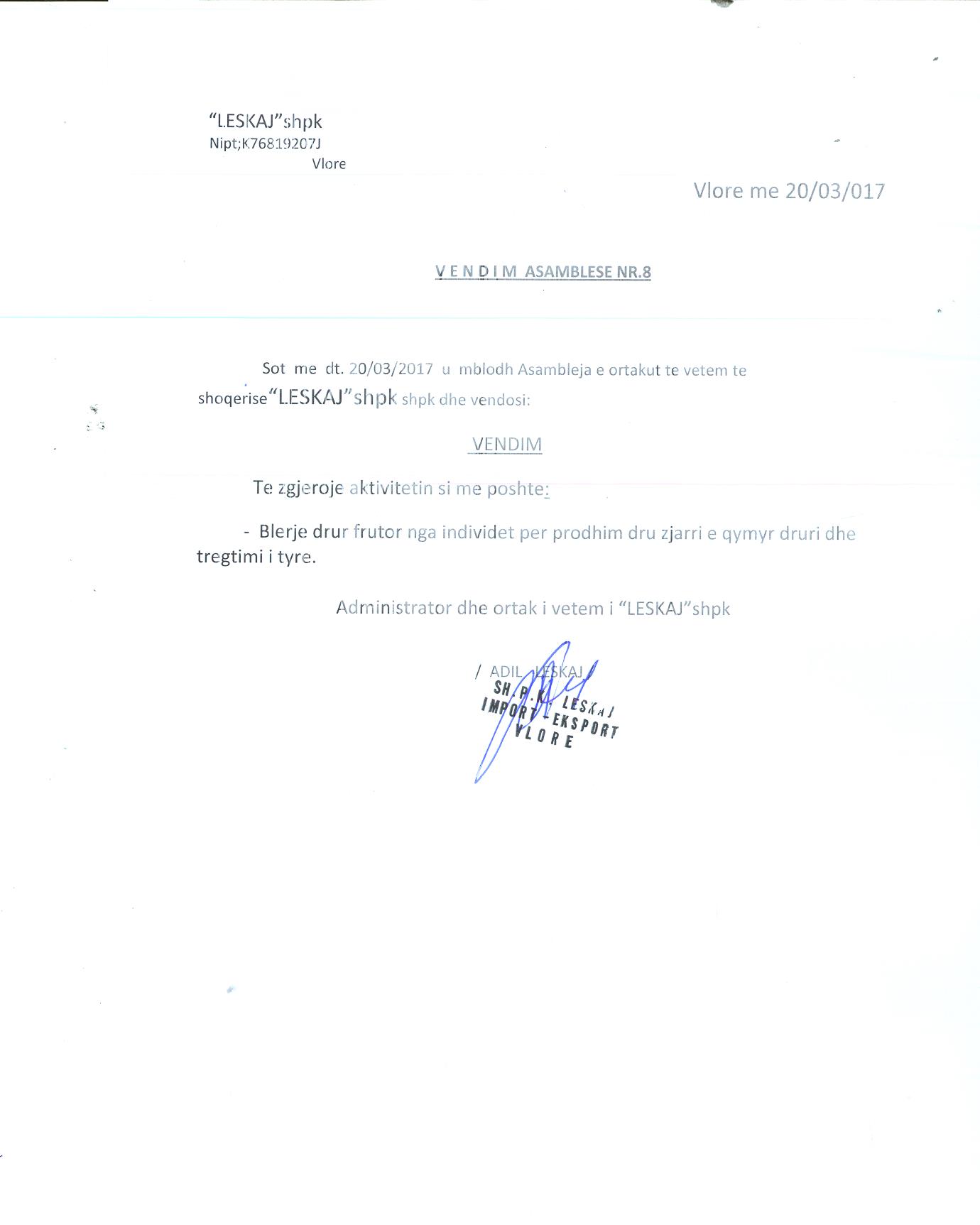 → Ekstrakt Historik i Regjistrit Tregtar, date 19.11.2021 → Akt themelimi, date 12.07.2007 → Vendimi i Asamblese, date 20.03.2017 |