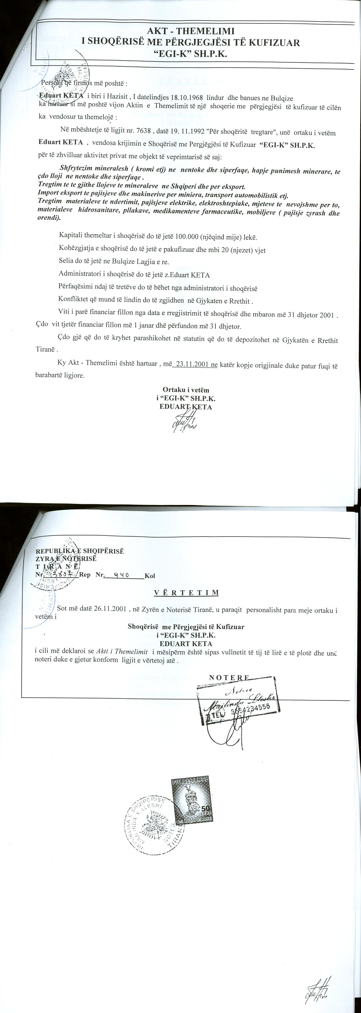 | Objekti i Veprimtarisë: | Shfytezim mineralesh (kromi) ne siperfaqe, hapje punimesh minerare te çdo lloji ne siperfaqe.Tregtim te te gjitha llojeve te mineraleve ne Shqiperi dhe per eksport. Magazinim, pergatitje dhe sherbime me Lendet Plasese. Import-eksport te pajisjeve dhe makinerive per minierat, transport automobilistik etj. Tregtim te materialeve te ndertimit, pajisjeve elektrike, elektroshtepiake, mjeteve te nevojshme per to, materiale hidrosanitare, pllakave, medikamenteve, mobiljeve(pajisje zyrash dhe orendi). Grumbullim dhe shitje skrapi. Prodhim e tregtim te materialeve te ndertimit, lendeve te perpunuara dhe te paperpunuara, te lendeve drusore, plastike, duraluminit, xhami, hekuri, dhe te çdo produkti tjeter te lejuar nga ligji ne fuqi. Shoqeria mund te ushtroje aktivitet ne fushen e hotelerise. Shoqeria mund te kryej te gjitha veprimet nevojshme per financime ne fushen e ndertimit te projekteve te gjitha llojeve,veprave industriale e civile, paisje e makineri te domosdoshme per to.Te bleje pasuri te patundshme, te kryej veprime tregtare dhe financiare te nevojshme per te arritur qellimin e saj, duke perlfshire (garanci, hipotekat dhe ne favor te paleve te treta, duke perfshire Shoqerite, ne kane te njejtin objekt aktiviteti ose dhe objekt aktiviteti te ndryshem. Te ushtroje veprimtari private ne fushen ndertimore, puime dheu, punime eventuale murature e beton arme-prishje dhe punime ne toke te germuar, prodhime materiale ndertimi, ndertime civile dhe ekonomike, ndertime rrugore, ndertime ura dhe veprra arti, ndertime hidraulike e hidroteknike, vepra te vecanta e punime speciale, punime restaurimi, punime karpentierie, punime ne impiante te prodhimit dhe shperndarjes se energjise, punime sherbimi, punime te sinjalizimit rrugor, impiante teknologjike dhe te vecanta dhe ne fushen e projektimit, projektues, konstruktor, vepra hidraulike, rruge, ura dhe vepra arti, studim gjeologjo-inxhinierik-hidrologjik etj. Prodhim i energjise elektrike nga burimet e rinovueshme. Ndertimi i objekteve hidroteknike, fotovoltaike, etj, te cilat bejne te mundur shfrytezimin e energjise qe gjenden ne natyre dhe qe jane te rinovueshme. Shitja e energjise elektrike klienteve dhe blerja e energjise elektrike nga operatore te ndryshem private apo shteteror brenda dhe jashte vendit. Transmetimi i nergjise elektrike ne sistemin e tensionit te larte, funksion i cili perfshin transmetimin ose interkoneksionin nderkombetar. Perdorimin e sistemeve te linjave, strukturave mbeshtetese dhe paisjesh transformuese per transmetimin e energjise elektrike. Shoqeria mund te bashkepunoje dhe/ose te marre direkt ose indirekt interesa ne shoqeri, firma, agjensi dhe ndermarrje te tjera, te cilat mund te kene edhe qellime te tjera aktiviteti. Te kryeje Financime dhe Ofrimin e sherbimeve te konsulences manaxheriale, financiare, IT, ligjore per shoqerite e kontrolluara prej saj dhe/ose te trete ne perputhje me legjislacionin e zbatueshem ne territorin e Republikes se Shqiperise. |