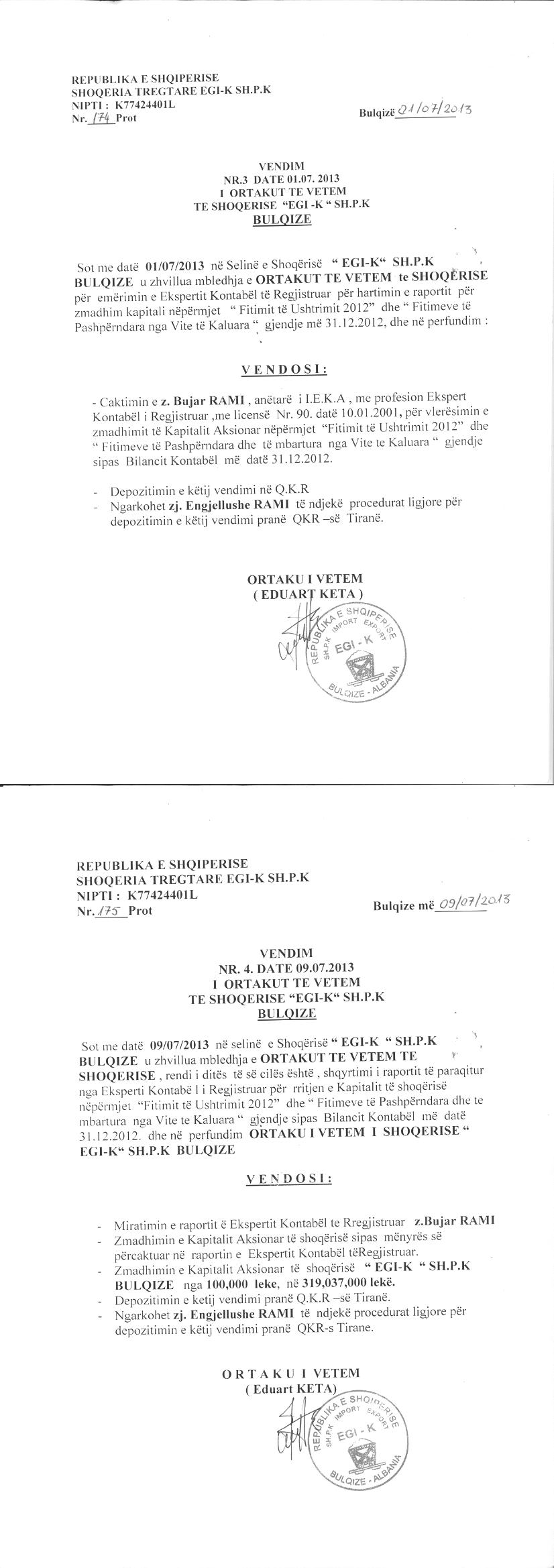 → Ekstrakt historik i regjistrit tregtar date 31.03.2022 → Akti i themelimit → Vendimi i ortakut te vetem per zmadhimin e kapitalit date 01.07.2013 → Vendim i ortakut te vetem per zmadhimin e kapitalit date 03.05.2016 → Ekstrakti Historik i Regjistrit Tregtar date 23.04.2024 → Urdher per heqjen e sekuestros konservative date 15.01.2024 → Vendimi i ortakut te vetem date 27.12.2023 → Raporti i Eksepertit Kontabel |