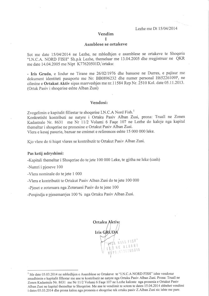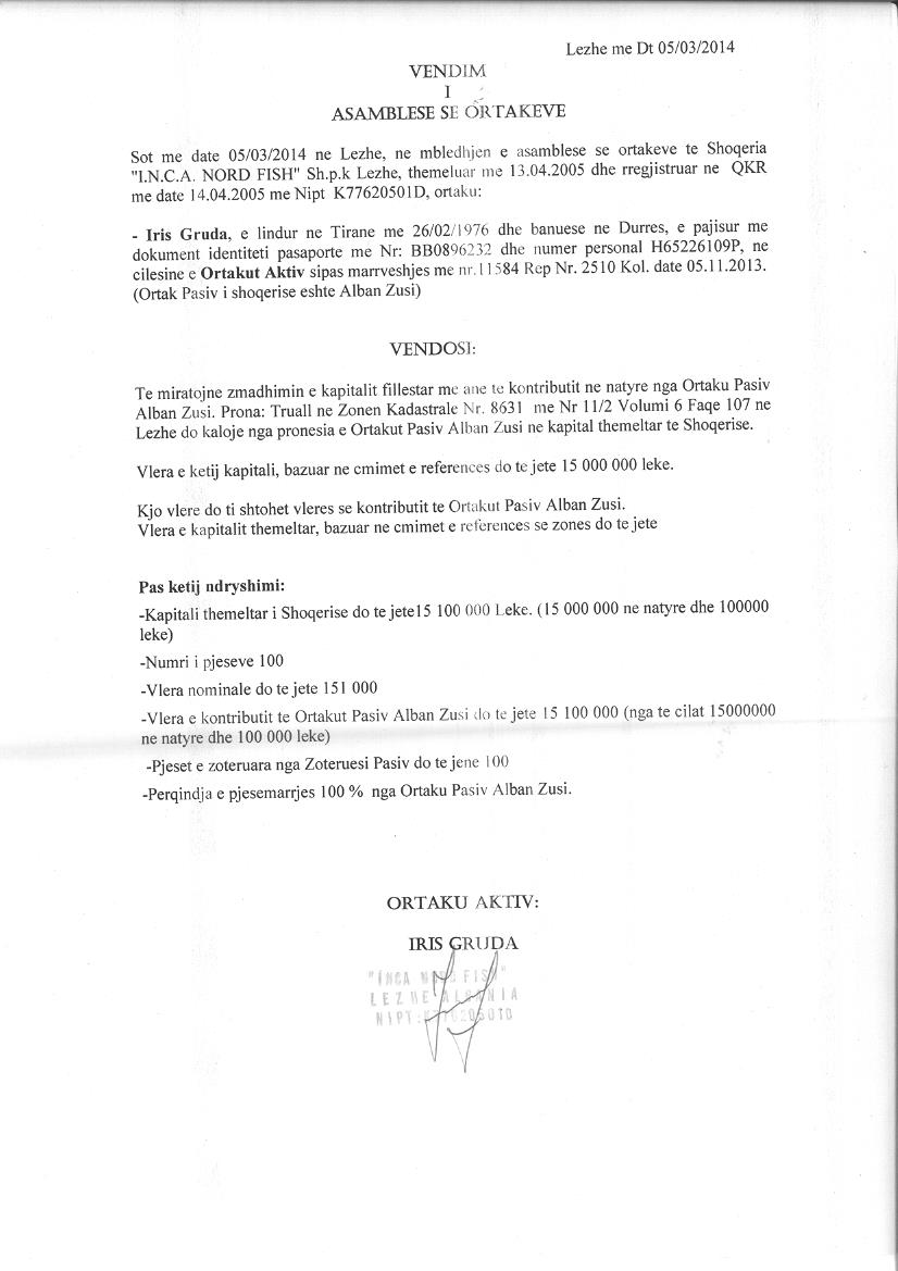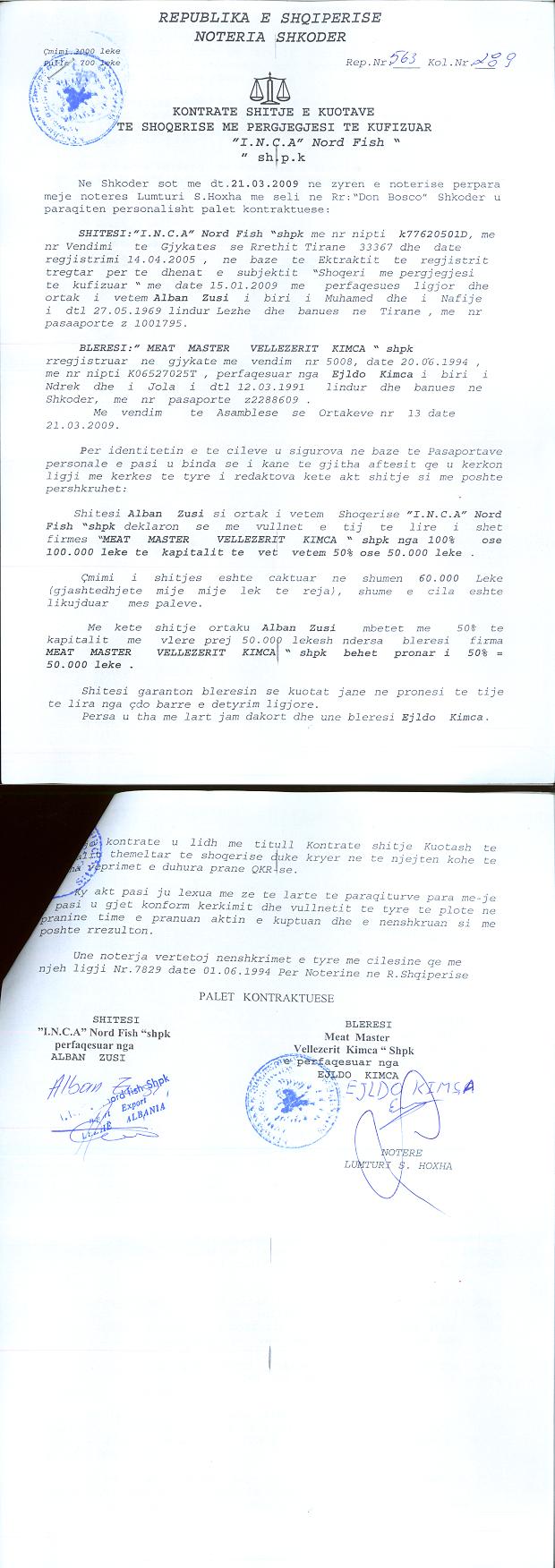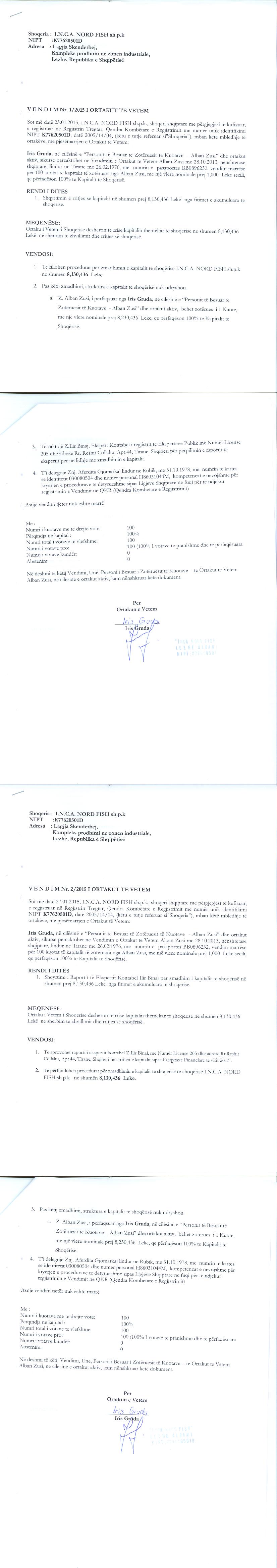 | Objekti i Veprimtarisë: | Perpunimi, konservimi dhe tregetim peshku dhe produkte deti, import eksport i mallrave te ndryshem te cfaredolloji, transport per vete dhe per te trete. Perpunim dhe kalibrim te zorreve natyrale per prodhim sallami dhe lloj aktiviteti te lejuar me ligj. Transport per llogari te vet. Perpunim i nenprodukteve shtazore gjysem te perpunuara. Ekstraktim i heparines krudo nga mukoza e zorreve natyrale te kafsheve. Prodhim Vaj me origjine shtazore. Tregtim me pakice dhe shumice te artikujve te ndryshem ushqimore dhe bujqesore. |