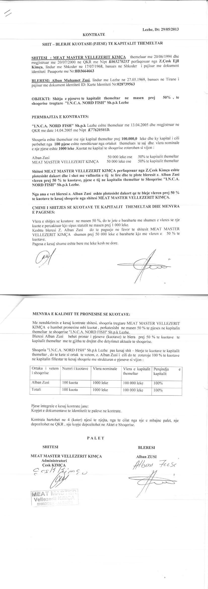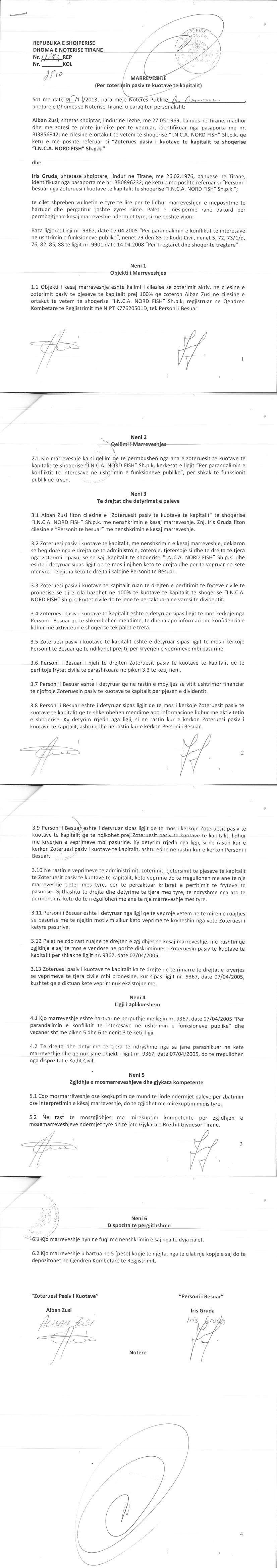 → Ekstrakt Historik i Regjistrit Tregtar date 12.10.2023 → Statuti dhe Akt themelimi i Shoqerise → Dokumente të Ndryshme → Kontratë Shitje Kuotash datë 21.03.2009 → Kontratë Shitblerje Kuotash Kapitali Themeltar datë 29.05.2013 → Marrëveshje për Zotërim Pasiv të Kuotave të Kapitalit datë 05.01.2013 → Vendim i Ortakut të Vetëm, Zmadhim Kapitali datë 05.03.2014 → Vendim i Ortakut të Vetëm, Zvogëlim Kapitali datë 15.04.2014 → Vendim i Ortakut të Vetëm, Zmadhim Kapitali datë 23.01.2015 → Marrëveshje Shitje e Kuotave në Zotërim Pasiv datë 10.02.2015 → Marrëveshje për transferimin e Kuotave datë 21.01.2016 → Urdhër për Vënien e Sekuestros datë 24.11.2021 → Urdhër për Heqjen e Sekuestros datë 24.12.2021 → Ekstrakt Historik i Regjistrit Tregtar date 17.04.2024 → Të dhënat e Investimit, Financimet Nga IPARD - Aksesuar nga Agjencia për Zhvillim Bujqësor dhe Rural AZHBR datë 17.04.2024 |