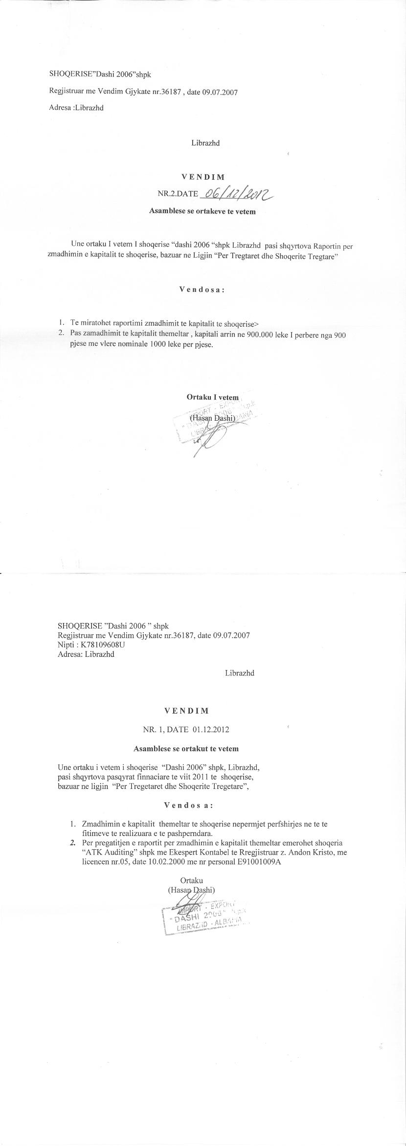 | Emërtime të tjera Tregtare: | "DASHI 2006" SHPK |