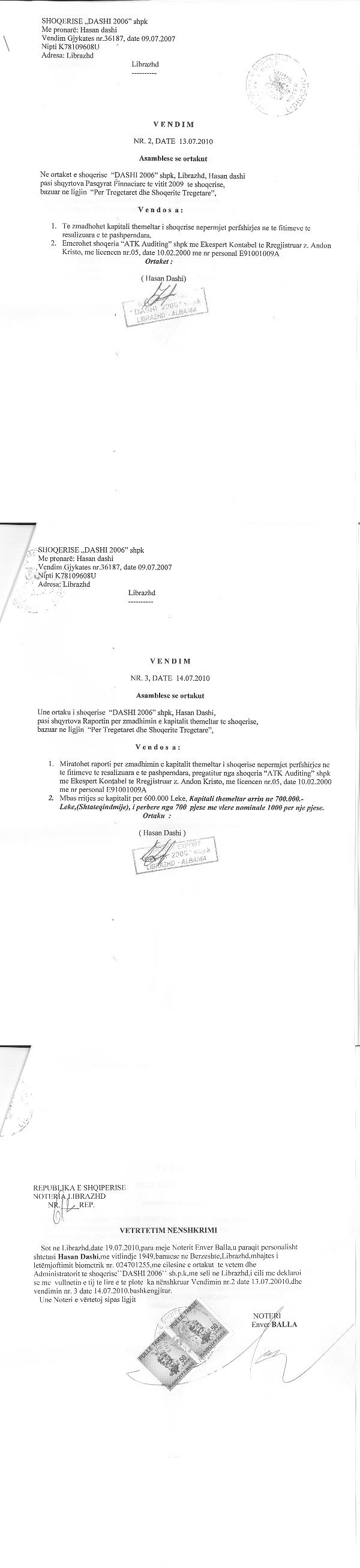 → Ekstrakt historik i regjistrit tregtar date 07.10.2021 → Akti i themelimit → Vendimi i ortakut te vetem per miratimin e raportit te zmadhimit te kapitalit date 09.07.2007 → Vendimi i ortakut te vetem per zmadhimin e kapitalit date 13.07.2010 → Ekstrakt historik i regjistrit tregtar date 02.09.2025 |