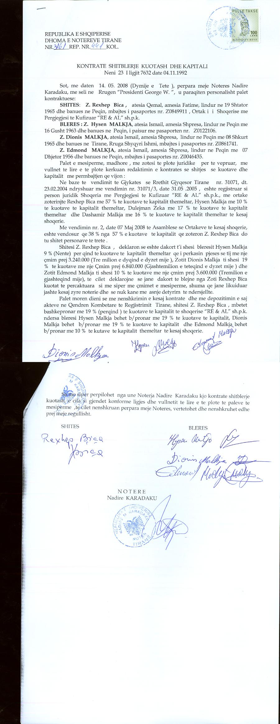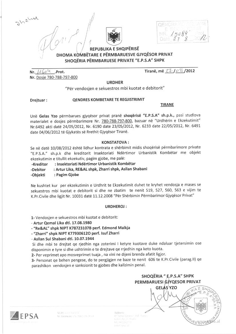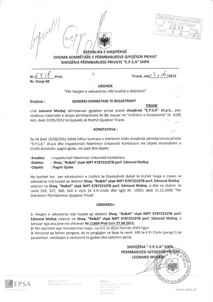 tjetersimin ose disponimin e tyre si dhe ushtrimin e te drejtave qe rrjedhin nga keto kuota. II. Me datë 27.08.2012, me anë të urdhrit Nr.11604 Prot. Nr. 780-788-797-800 Dosje, lëshuar nga Shoqeria Permbaruese Private “E.P.S.A” sh.p.k, u urdhërua: “Vendosja e mases se sekuestros konservative mbi kuotat e pales debitore shoqeria “RE & AL ” sh.p.k pajisur me NUIS(NIPT)- K78723107B me perfaqesues ligjor Z. Edmond Malkja si dhe mbi te drejtat qe rrjedhin nga zoterimi i ketyre kuotave duke ndaluar tjetersimin ose disponimin e tyre si dhe ushtrimin e te drejtave qe rrjedhin nga keto kuota.“ III. Me datë 03.06.2013, me anë të urdhrit Nr. 6518 Prot., leshuar nga shoqeria permbaruese private "E.P.S.A" shpk, u urdhërua: heqja e sekuestros mbi kuotat qe debitori shoqeria "Re&Al" sh.p.k, me NUIS (NIPT) -K78723107B, e kerkuar nga ana jone me shkresen Nr. 11604 Prot. date 27.08.2012. IV. Me datë 26.06.2013, me anë të Urdhrit Nr.7218 Prot., lëshuar nga Shoqëria permbaruese private "E.P.S.A" sh.p.k., u urdhërua: "Heqja e sekuestros mbi kuotat te shoqerise "Re & Al" me Nipt K78723107B e kerkuar me shkresen Nr.7386 Prot date 22.05.2012." |